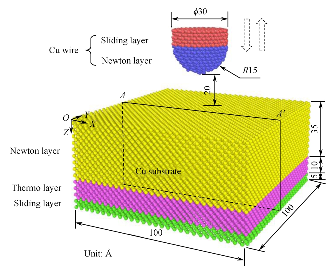 In this work, a local part of the wire and corresponding local part of the substrate are developed to model the nanoindentation, contact, and separation of the wire and substrate [8] . The basic geometry of the Cu-Cu wire bonding model is shown in Fig. 1-1. There are two parts in the model: Cu wire and Cu substrate. The Cu wire consists of two different layers: a sliding layer and a Newton layer. The Cu substrate consists of three different layers: a sliding layer, a thermo layer, and a Newton layer. The Newton layers perform the contact behavior during the simulation. The sliding layers are used to provide the desired displacements. For the Cu wire, this layer is used to make the indenter move correctly. The thermo layer is used to control the temperature with the NVT ensemble (constant number of atoms, volume, and temperature) [21] . The initial temperature of the thermo layer is set at 0.1 K because the fluctuations of the atomic stress distributions due to the thermal effects can be significantly decreased [22] .