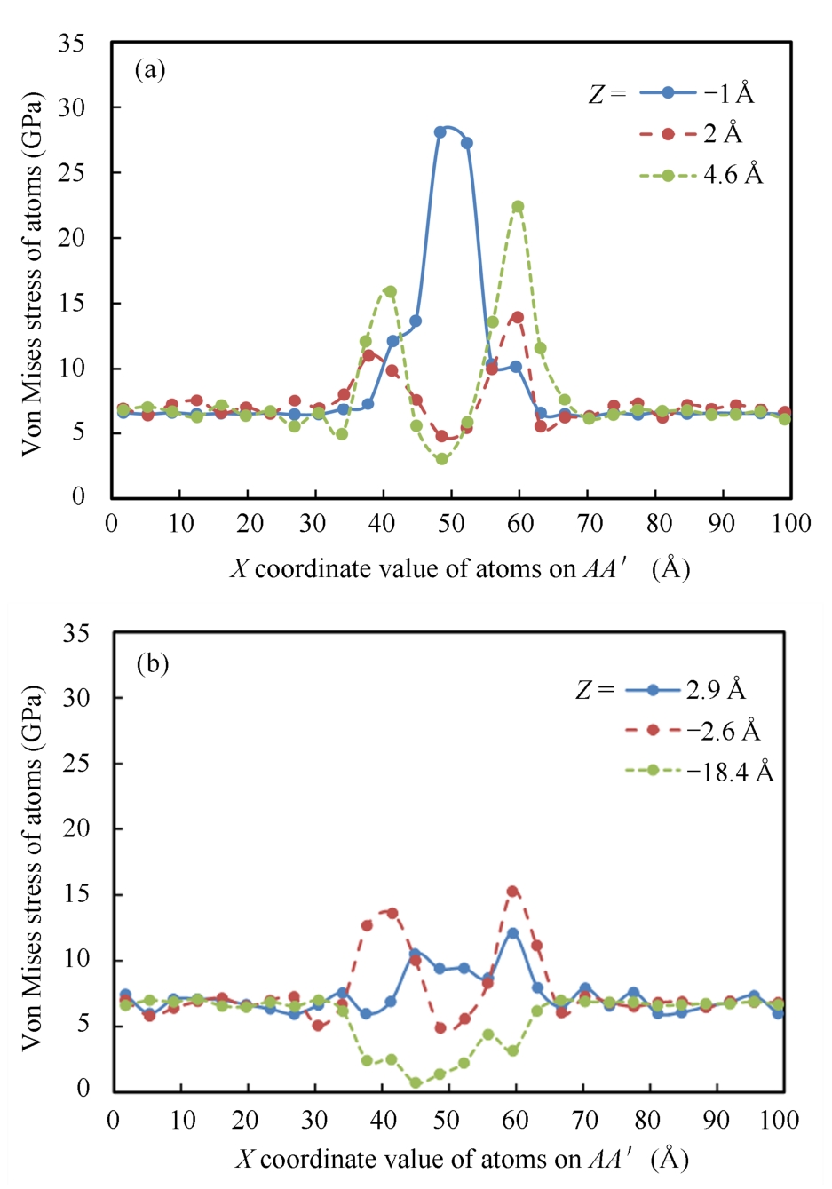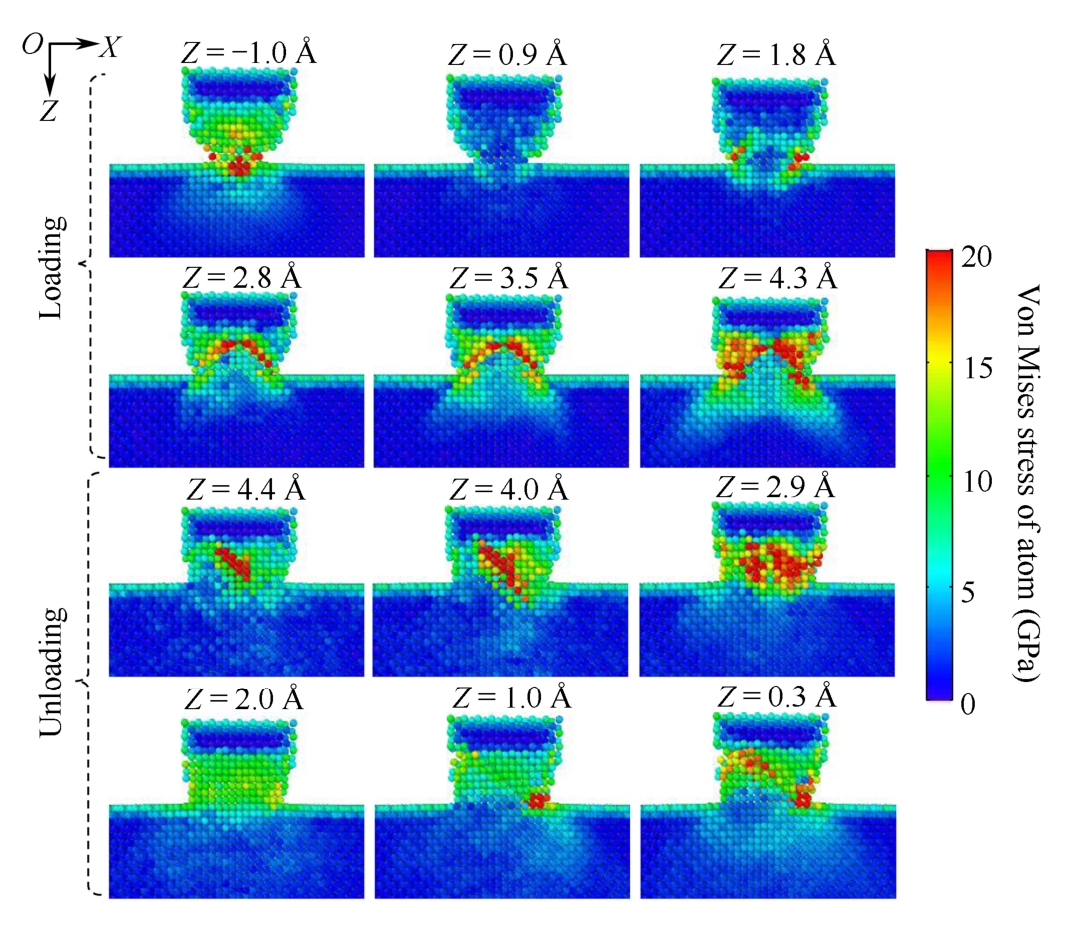 Fig. 1-5 shows contours of von Mises stress on the slice of atomic (010). During the loading process, the main force acting on substrate atoms changes from attraction to repulsion. For the substrate, an indentation displacement of-1.0 Å is observed. The maximum von Mises stress on the substrate is under the wire and close to the surface. This is because the attractive force between the wire and substrate appears and increases significantly during the initial contact stage. As the indentation displacement continues to increase, the equivalent von Mises stress at the contact edges of the substrate is higher than that at the center of contact. For the wire, after the indentation displacement reaches 2.8 Å, dislocations in the middle area of the Cu wire are observed. Therefore, the stress concentration occurs around dislocations.