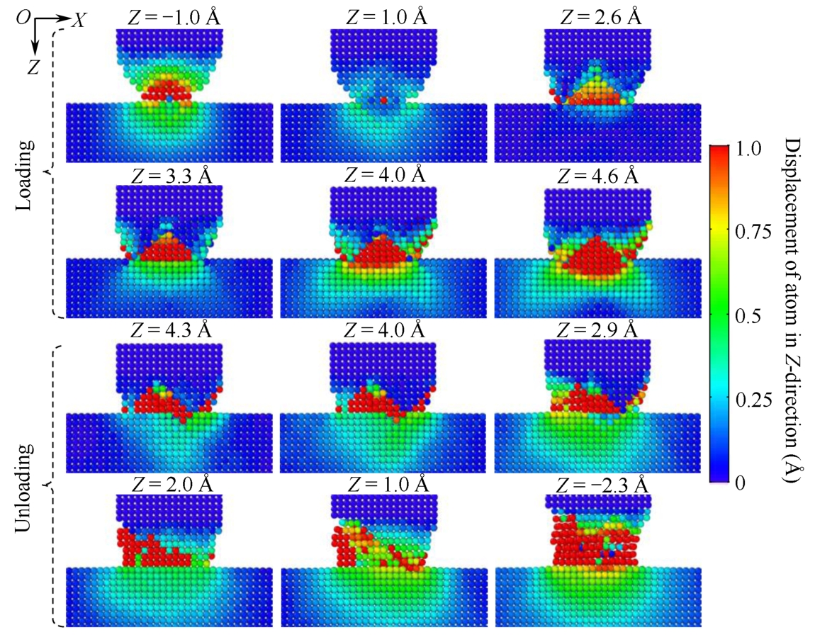 To evaluate the deformation behavior of the contact surface, the indentation morphology at the atomic level is investigated. Fig. 1-4 shows atomic (010) slice of the indentation morphologies during the loading and unloading processes. The color change corresponds to the change in atomic displacement. Blue color represents atoms without movement (0 Å), and red color represents atoms that move furthest (1 Å). Atoms near the contact region of the wire and substrate change from blue to red, indicating the generation of deformations. Corresponding to the load force of the Cu wire versus the indentation displacement curve, when the indentation displacement reaches-1.0 Å, the attractive force makes the atoms on the surface bulging and bonded together. With the increase of the indentation displacement, the repulsive force increases, and the attractive force decreases; therefore, the atomic displacement decreases. For the substrate, when the indentation displacement reaches 2.6 Å, the atomic displacement of the substrate reaches approximately 0 Å, due to the equilibrium of the attractive and repulsive forces. After that, the substrate atomic displacement increases by increasing the indentation displacement. For the wire, the atomic displacement of the wire first increases because of the attractive force. Thus, it reduces because of the attraction and repulsion equilibrium. After the indentation displacement reaches 2.6 Å, dislocations in the middle area of the Cu wire slice are observed and the atomic displacement of the wire increases by increasing the indentation displacement.
