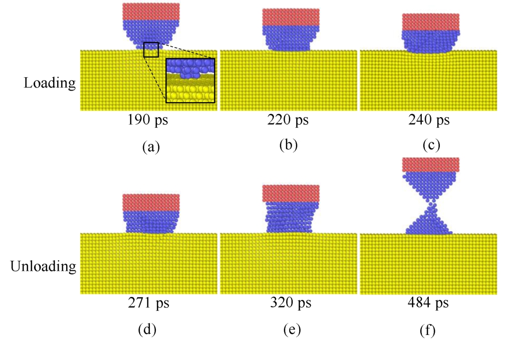 Fig. 1-2 shows an atomic (010) slice of the Cu wire and substrate during the loading and unloading processes. An attractive force between the wire and substrate is observed when the wire is close to the substrate, which displays the bulging of the substrate surface atoms under the wire tip, as shown in Fig. 1-2(a). The attraction force increases with the decrease of the distance between the substrate and wire. The substrate surface atoms are rapidly contacted by wire atoms, as shown in Fig. 1-2(b). As the wire continues to press downward, the repulsion between the substrate and wire becomes the main force. Because the substrate atoms are compressed at the lower end of the wire, the atomic lattice begins to deform and the strain energy increases. When the repulsion exceeds a certain value, the lattice structure breaks, and the substrate atoms start to rearrange and the strain energy is released, as shown in Fig. 1-2(c). During the unloading process, the main force acting on the substrate atoms changes from repulsion to attraction. Upon retraction of the wire away from the substrate surface, a small portion of the substrate atoms adhere to the indenter surface, as shown in Fig. 1-2(d). Continuing the retraction of the wire, a neckband is formed between the indenter and substrate, as shown in Fig. 1-2(e). At the time of 484 ps, the wire separates from the substrate, as shown in Fig. 1-2(f).