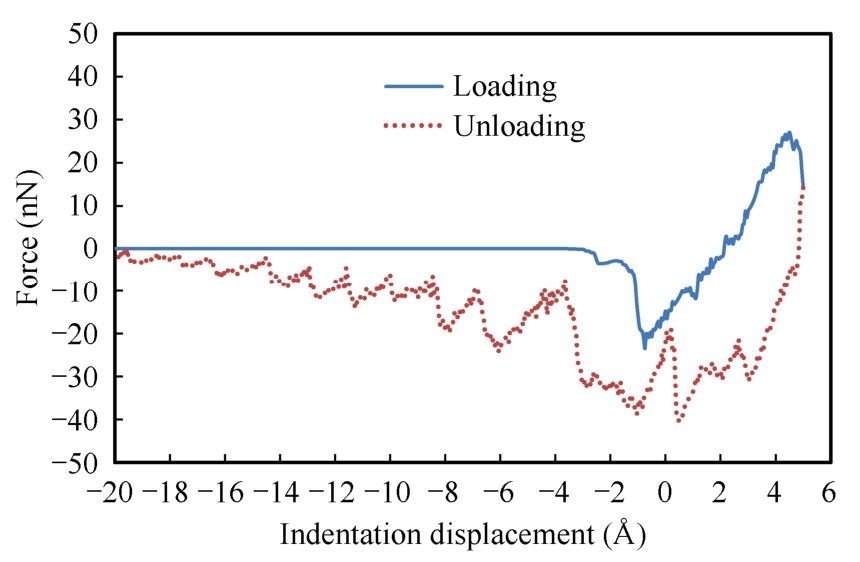 The variations of the Cu wire load force versus the model indentation displacement are shown in Fig. 1-3, which consists of the loading curve and unloading curve. During the initial contact stage, in which the indentation displacement is-3.6 Å, the attractive force between the wire and substrate appears, and increases significantly. This instability corresponds to the jump-to-contact (JC) phenomenon [26] . During the JC process, the kinetic temperature of the system increases due to the bulging of the surface atoms, then this temperature rise is dissipated to the ambiance through stochastic collisions. At the onset of contact formation, in which the tip approach is-0.75 Å, the maximum attractive force reaches a value of 23.5 nN. As the indentation displacement continues to increase, the repulsive force increases and becomes the main force. When the indentation displacement equals 2.32 Å, the contact load is approximately zero, the attractive and repulsive forces between the wire and substrate achieve the equilibrium point. Further indenting the wire to the substrate, the contact load increases linearly by increasing the indentation displacement. When the indentation displacement reaches 4.50 Å, it meets the yielding point and the plastic deformation starts. During the unloading process, the repulsive force considerably decreases and changes to attractive force as the indentation displacement reaches 4.57 Å. The loading and unloading curves do not coincide, the unloading curve presents hysteresis. This is explained by the wire indenter retraction away from the substrate; a neckband forms and breaks between the indenter and substrate because of the adhesion force, as shown in Fig. 1-2(f).