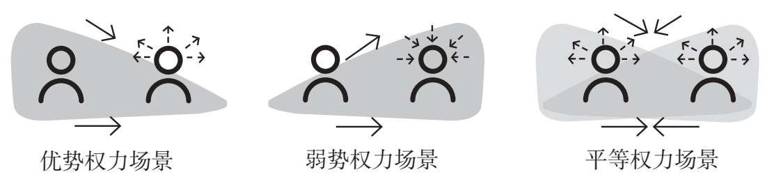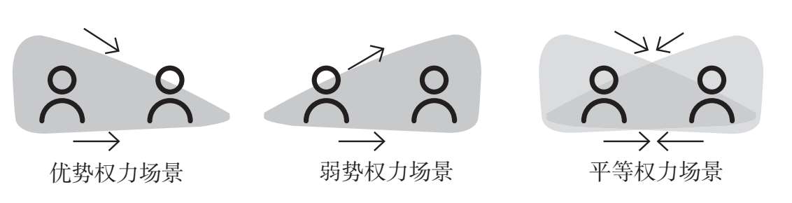特定权力结构:所有的交往场景背后都有特定的权力结构,在微观层面,我们可以将其分成三类:优势权力场景、弱势权力场景、平等权力场景。