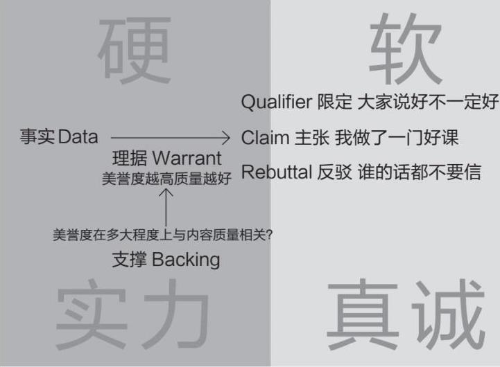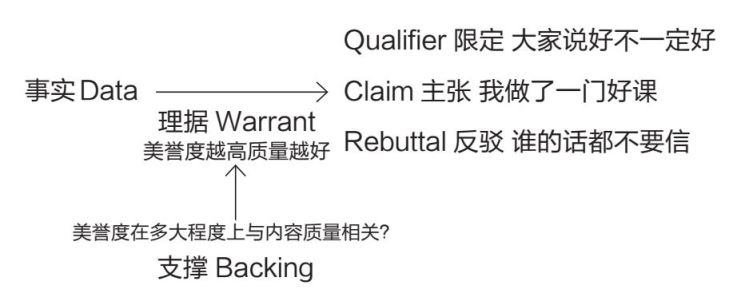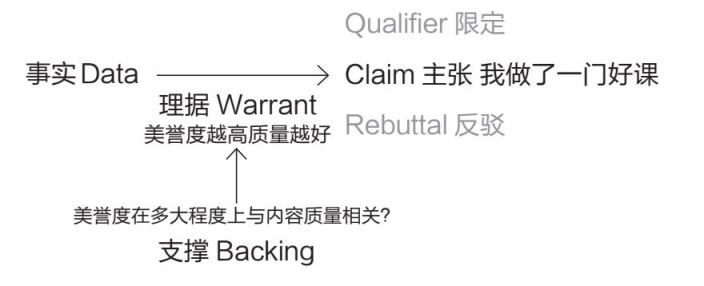 仅靠事实并不能说明什么,我还要讲出 理据 (warrant),来说明这些事实为何能论证自己的主张,此处的“理据”似乎是不言自明的,因为点击量和美誉度就能反映课程质量。