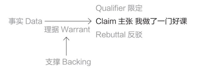 仅有“兴趣”还不够,还要让读者“信服”。要想让一个人的态度从质疑变为信服,我可以使用图尔敏论证模型。当我论证的主张(claim)是“我做出了一门非常精彩的说话课程”时,图尔敏论证模型可如下图搭建。