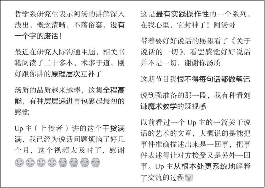 我首先需要列举 数据 或 事实 :“这本书脱胎于我在B站(视频弹幕网站)开设的关于说话的课程,上线以来累计播放量已超过百万,也收到了很多好评。”