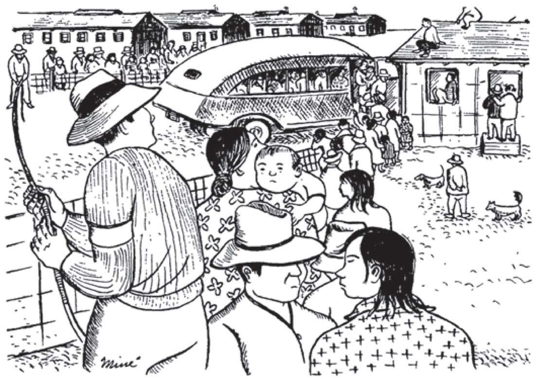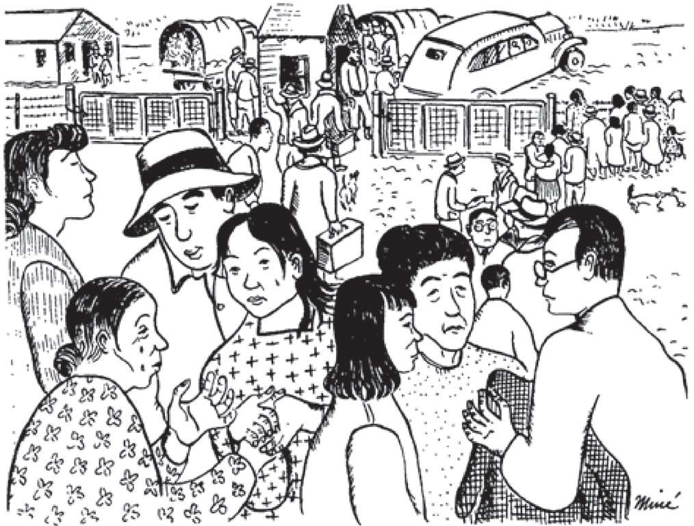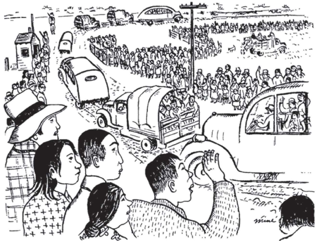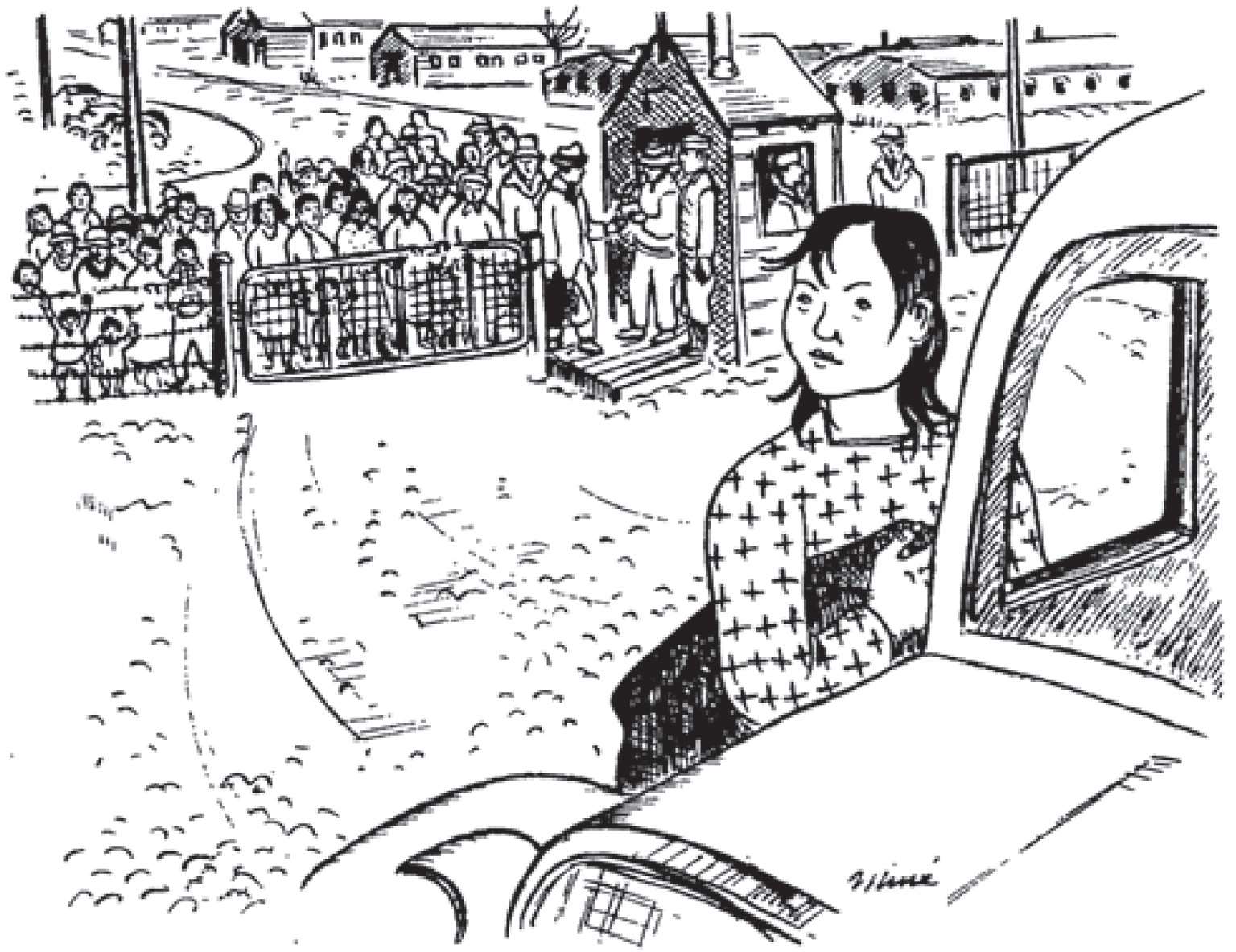 I dashed to the mess hall for a bite to eat, then to the Administration Office, picked up my pass and ration book at the Internal Security Office, and hurried to the gate. There I shook hands with the friends who had gathered to see me off. I lined up to be checked by the WRA and the army.