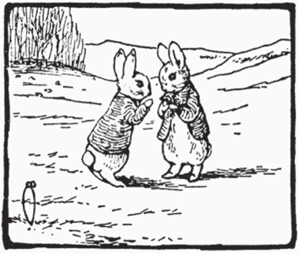 Benjamin climbed over the wall, into a meadow [36] . He found another mole trap newly set; he was still upon the track of Tommy Brock. It was getting late in the afternoon. Other rabbits were coming out to enjoy the evening air. One of them in a blue coat by himself, was busily hunting for dandelions [37] . — “Cousin Peter! Peter Rabbit, Peter Rabbit! ” shouted Benjamin Bunny.