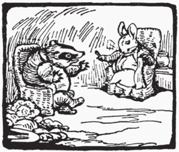 Tommy Brock was a short bristly [7] fat waddling [8] person with a grin; he grinned all over his face. He was not nice in his habits. He ate wasp nests and frogs and worms; and he waddled about by moonlight, digging things up.