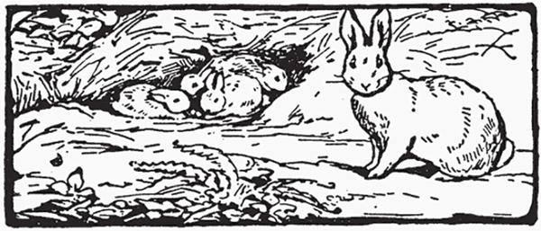 The sunshine [46] was still warm and slanting on the hill pastures. Half way up, Cottontail was sitting in her doorway, with four or five half-grown little rabbits playing about her; one black and the others brown.