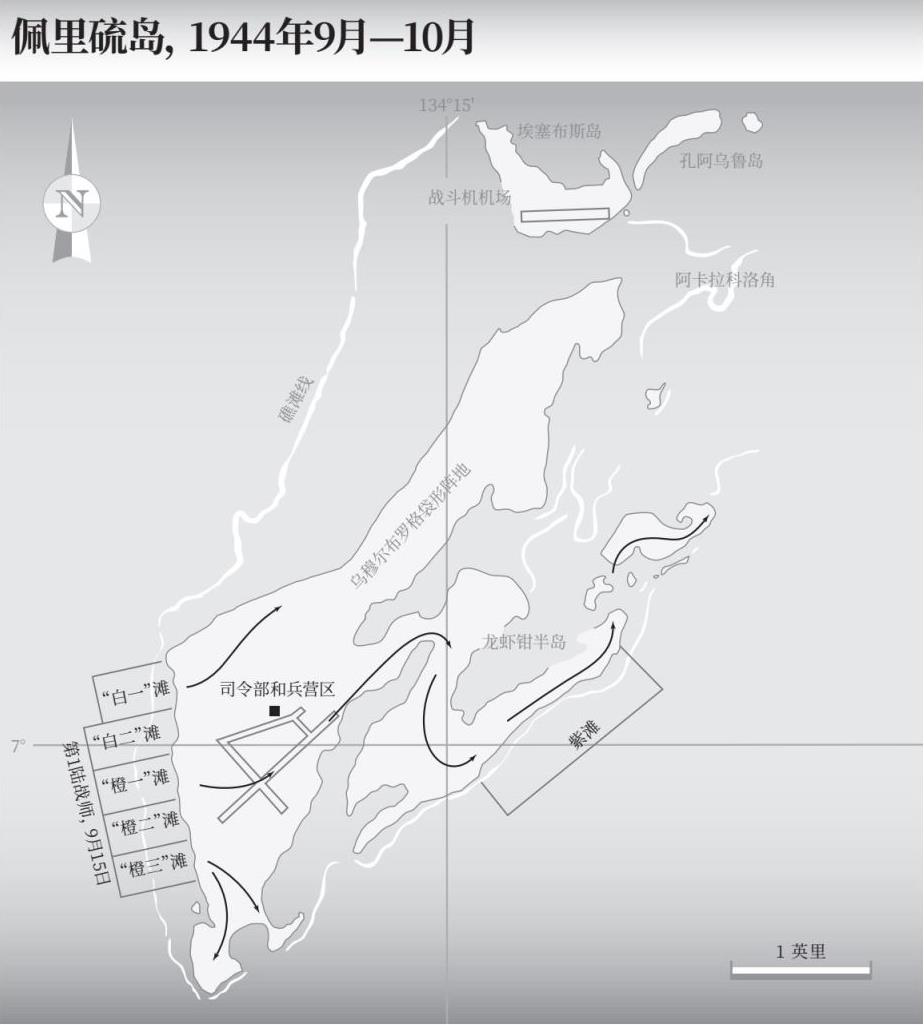 和往常一样,低阶官兵们要到出海踏上航程之后才知道自己要去哪儿。听说佩里硫是目的地后,他们耸了耸肩。没人听说过这个地方,不过也无所谓——他们打仗打到现在,一直都是在看起来差不多,分不清谁是谁的热带岛屿上作战,一个接着一个。每艘船都得到了一个泡沫塑料制作的岛屿的比例模型,军官们拿着教鞭向各排介绍了岛上的地形特征和地标。佩里硫平坦的南半部是机场,两条跑道和一条滑行道组成了一个“4”字形,旁边建有宽大的柏油停机坪。登陆滩头在其西南海岸,分为“白一”滩和“白二”滩,还有“橙一”“橙二”“橙三”滩。岛屿北部主要是覆盖着稀疏灌木的石灰岩山。第1陆战师将要在D日建立滩头阵地,D+1日拿下机场并将岛屿一分为二,在D+2和D+3日席卷北部山区。计划就是这样的。