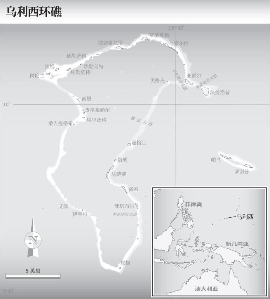 10月1日拂晓前,两支航母特混大队鱼贯驶入潟湖,在北部锚地下锚:这是博根将军的第38.2大队(包括哈尔西的旗舰“新泽西号”)和谢尔曼将军的第38.3大队。这大约是第38特混舰队的一半兵力,一支由60艘涂着蓝灰色迷彩、装有高大桅杆的钢铁战舰组成的庞大舰队。在它们的巨大体形面前,一旁的小岛都相形见绌。这天早晨,“海蜂”部队的麦坎德利斯上尉起床走到了海滩上:“我走出椰子树林,向潟湖看过去,我简直不敢相信自己的眼睛。那里满是战舰——大大小小,各种类型。航母、战列舰、巡洋舰、油轮、驱逐舰,10条或12条潜艇,等等,全都平静地停在锚地里。他们是在夜间溜进来的。我不知道它们怎样才能如此安静地开进来,之后我就意识到我们为什么要来到乌利西了。这是个巨大的掩蔽场所,强大而庞大的美国特混舰队将会在此集结。” [20]