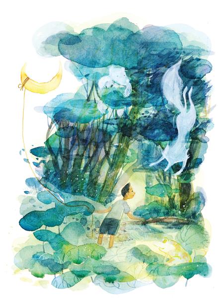 那一夜,我在田野里溜达了很久。我走,月亮跟着我走,影子也跟着我走。途经一座小小的石桥,我在桥边坐下歇脚,月亮也无声无息地停住了。我低头看桥下,水流潺潺,月亮碎成一堆凌乱的银光。我心想,那些小小的花翅鱼,水中望月,看到的恐怕也只是一堆凌乱的银光。它们该到静水里赏月。