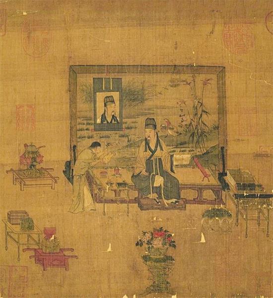 《宋人物图》中的这幅人物肖像画,未必就是自画像,也可能是主人请他人画的,不过说它是主人自己的肖像则没有疑问。将自己绘入图画,挂于书房或客厅,这在宋朝士大夫群体中是很常见的事情。这类肖像画,宋人称为“写真”。当然,如果是画技高超的士大夫,也可以对着镜子给自己画一幅自画像,这叫“自写真”。