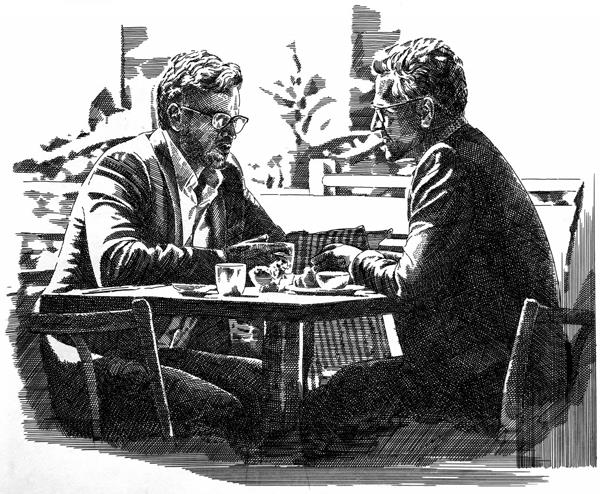 斯皮罗先到了餐厅,静静地坐在餐桌旁的皮革椅上,啜饮着冰凉的马提尼酒,听着周围人的谈话。他从事销售业务,每天拎着黑色公文包在全国大大小小的城市奔波,而他去过的每座城市的每家餐厅都像这里一样充斥着“嗡嗡嗡”的谈话声。但是今天,因为心乱如麻,斯皮罗感觉餐厅里的谈话声异常刺耳。