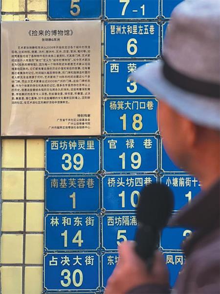 这座“捡来的博物馆”位于广州市海珠区的怡乐社区内,是一处占地面积40余平方米的平顶房,里面陈列着老式摆钟、破碎的瓷器、大头贴等旧物。最显眼的是博物馆四周外墙贴满的铝制门牌,蓝色的、绿色的,密密麻麻,数量达2100多块。