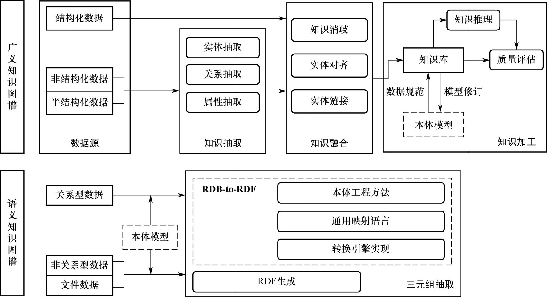 知识图谱的构建过程实际上是从大量关系复杂、类型繁多、结构多变的数据中获取计算机可读知识的过程,是数据融合与链接的纽带。从逻辑层次上看,知识图谱分为模式层和数据层,数据层由一系列以三元组为表现形式的事实组成,模式层(也称概念层)则是作为数据层的“上层建筑”,通过积累沉淀的知识集合——本体库来规范数据层的事实表达。因此,知识图谱的核心是建立本体模型和实体数据库,按照二者构建顺序可将知识图谱构建方法分为“自顶向下型”和“自底向上型”两种。“自顶向下型”是指在定义好本体和数据规范的前提下再抽取数据,这种模式适用于存在可量化的行业逻辑的领域,如医疗、法律、金融等。“自底向上型”则是先抽取实体数据,选择置信度高的实体数据加入知识库再逐层抽象出本体模型,常应用于数据量庞大但行业逻辑难以直接展现的领域,如Bing Satori、Google知识图谱。对于新兴领域,通常采用两者结合的方式建模。从数据模型上看,知识图谱分为RDF图和属性图,如前所述,前者通常是指语义网领域提出的基于RDF三元组存储的语义知识图谱,侧重知识的发布和链接;属性图则主要指数据库领域发展出的基于属性图数据库的广义知识图谱,侧重知识的计算与挖掘。