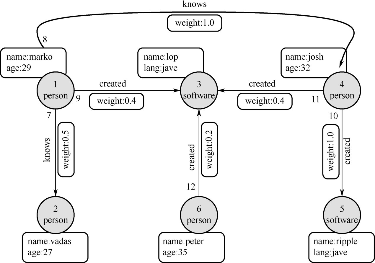 以图1-6所示的属性图样例为例进行说明,根据属性图的要素,software、person分别代表类为软件、人员的节点,created、knows分别代表关系为开发、认识的边,软件节点的属性包括名称和开发语言,人员节点的属性包括姓名和年龄。这个属性图描述了2个软件节点和4个人员节点的关系,如节点3的入边集合为{边9,边11,边12},属性集合为{name=lop, lang=java},表示节点3的软件由人员节点1、4、6开发,软件名称是lop,开发语言是java;节点4的入边集合为{边8},出边集合为{边10,边11},属性集合为{name=josh, age=32},表示节点1的人员认识节点4的人员,节点4的人员姓名是josh,年龄32岁,开发了节点3和节点5的软件。