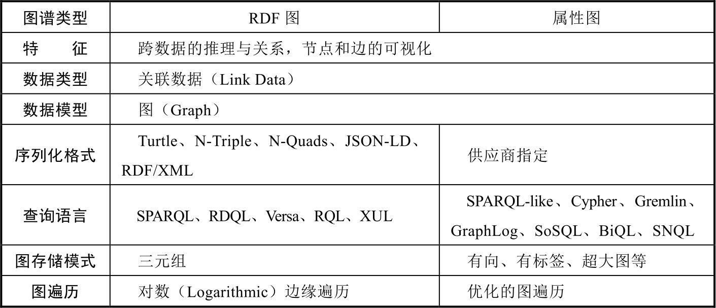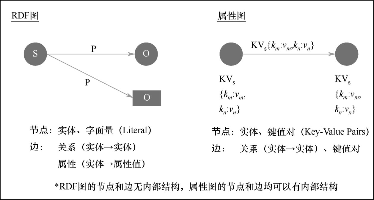 从数据模型的角度来看,概念网络——知识图谱本质上是一种图数据,数据模型规范依据知识图谱的领域特征而定,主要有RDF图和属性图两种形式,两者的逻辑视图如图1-3所示。其中,属性图具备RDF图所没有的节点和边的内部结构,可以表达实体/关系的属性。