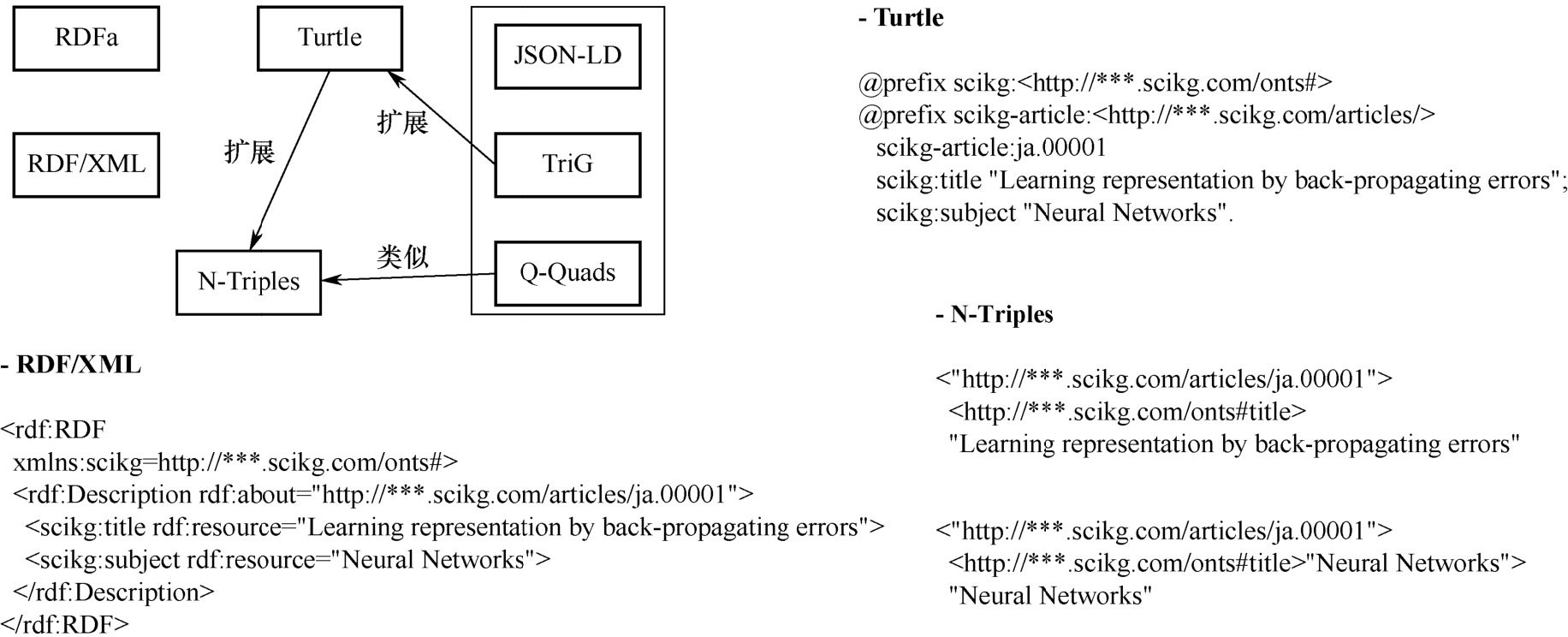 图1-4中分别给出了“论文ja.00001的标题(title)是Learning representation by back-propagating errors,主题(subject)是Neural Networks”这一RDF三元组集的三种序列化格式。RDF/XML(.rdf)指用XML格式表示RDF数据,是树状文档和基于三元组图的混合体,表达较为冗长;N-Triples(.nt)则是指用多个三元组来表示RDF数据集,每行表示一个三元组,这种表示方式最为直观,有利于机器的解析和处理,开放领域知识图谱DBpedia及学术知识图谱SciGraph均采用这种方式发布数据;Turtle(.ttl)是目前应用最为广泛的序列化格式,数据紧凑、可读性好,使用@prefix对RDF的URI前缀进行缩写,Turtle与N-Triples相比解析成本更高;其他格式如JSON-LD(.json)是轻量级链接数据格式,在工程应用方面更具优势。