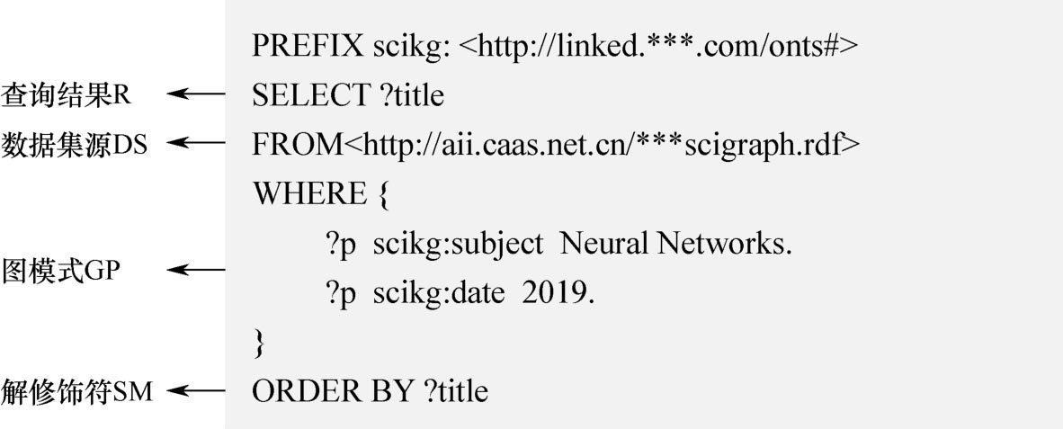 例如,查询scigraph图中2019年发表的主题为Neural Networks的论文的标题(?title),SPARQL查询语句语法分析如图1-5所示。除简单查询外,SPARQL还支持多字段匹配和数据属性匹配,根据需求可搭配CONCAT函数、FILTER关键字等联合使用,实现检索结果的字符串拼接、条件过滤等。