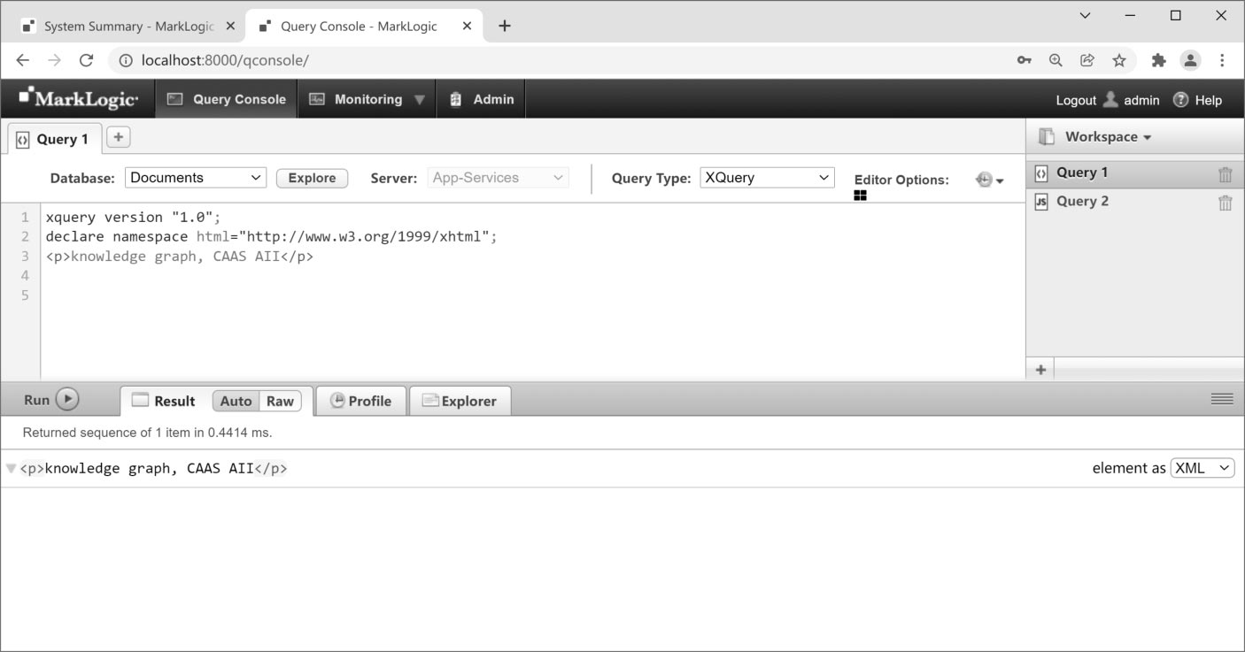 MarkLogic的最大特点在于其数据集成功能敏捷且简单,无须预先定义模式(数据可以按照原本的格式存储)或依赖复杂的ETL过程。它可以在商用硬件的集群中水平扩展到数百个节点、PB级数据、数十亿个文档,每秒可处理数万笔事务,集群随着数据或访问需求的增长或收缩而水平扩展,并提供自动故障转移、复制和备份服务。MarkLogic非商用版采用注册制,MarkLogic Console界面如图1-9所示。MarkLogic支持JavaScript脚本、SPARQL Query、SPARQL Update、SQL、XQuery查询方式及文本、XML、HTML结果形式。