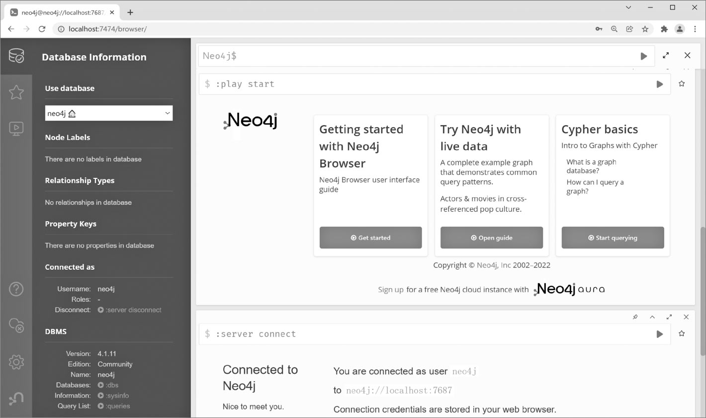 。相较于面向RDF的三元组数据库,图数据库在数据关系检索方面具有更大的优势,通常以简单的Cypher语句便可实现查询功能,且执行效率更加高。Neo4j V4.1.11启动后浏览器界面如图1-14所示,具体使用将在后续章节中详细介绍。