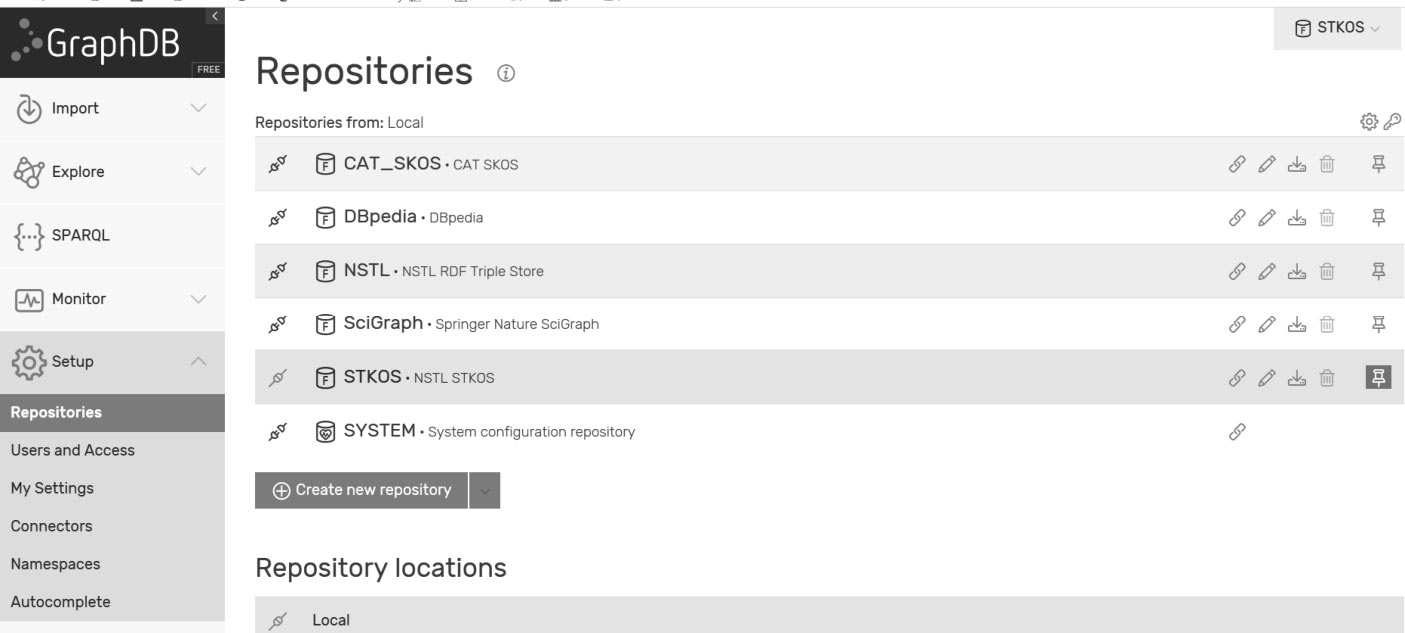 GraphDB支持网页客户端单个较小文件的上传加载功能,也支持网络端本地或服务器目录的批量大文件上传,并提供丰富的解析参数设置功能。加载同样的136个文献类RDF数据文件总用时约6小时,查询特定论文结果返回时长0.1秒,与Virtuoso相比,效率较低。从官方的介绍中可以看出,Virtuoso、GraphDB均是多模型混合存储数据库,同时支持RDF图和属性图数据管理,由于其SPARQL的图形遍历性较差,实际应用中多作为RDF三元组数据库使用。