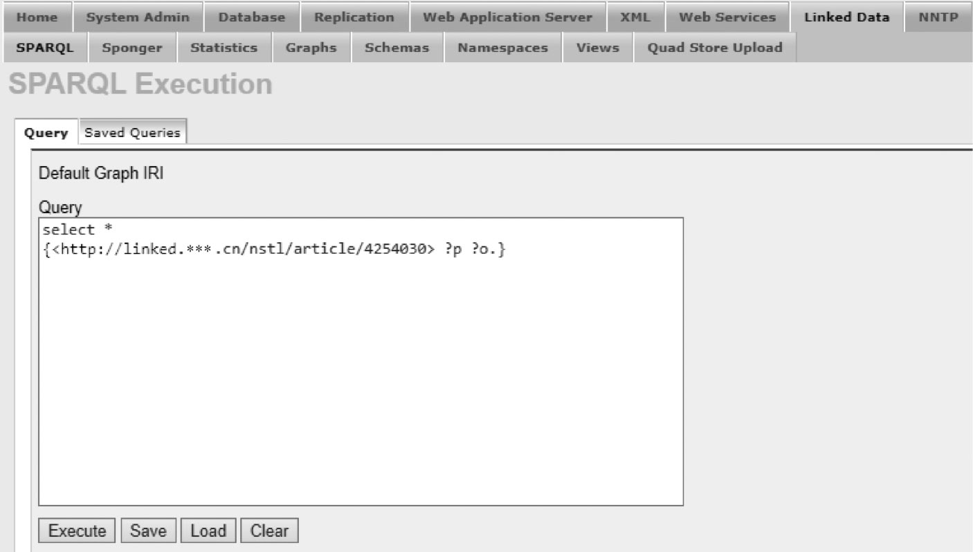 基于136个文献类RDF数据文件(共计2.97亿个RDF三元组、容量40.8GB)进行数据加载测试,总耗时2小时,平均38485个三元组/秒。同时,加载DBpedia开源数据共147个文件(共计30亿个RDF三元组、容量700GB),耗时16小时,平均51574个三元组/秒。Virtuoso中SPARQL查询示例如图1-11所示,包含查询特定论文的查询界面和结果界面,从近40亿个RDF三元组中查询单个实体对象耗时18.45毫秒。