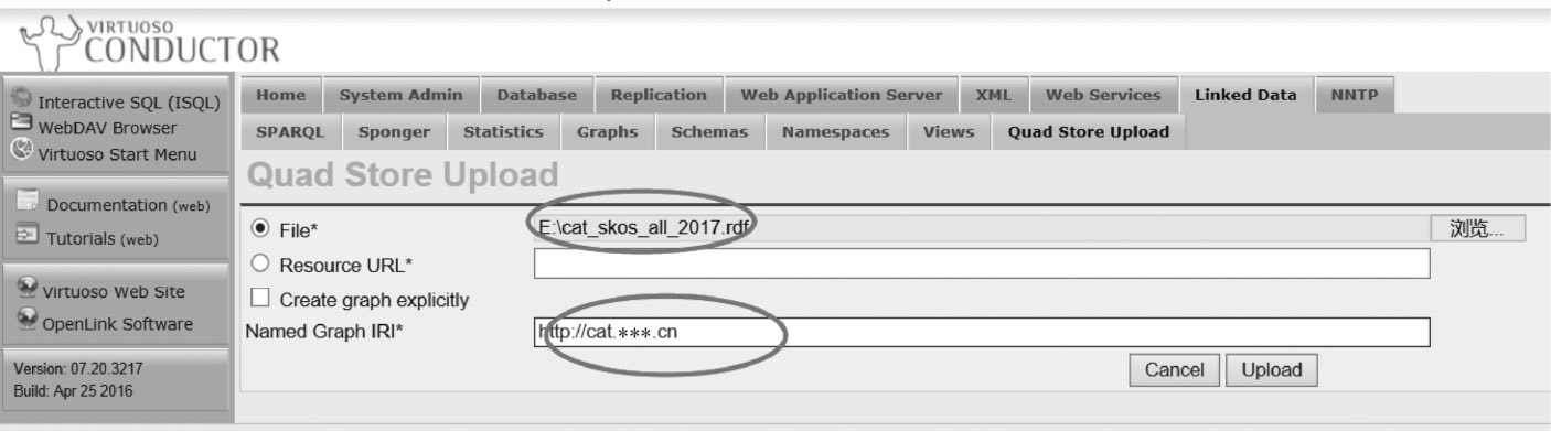 Virtuoso是语义网项目常用的一种多模型混合关系数据库管理系统(Relational Database Management System, RDBMS),支持对关系表和属性图的数据管理,是一个高性能、可扩展、安全和基于开放标准的平台。其基础源自开发了多年的传统关系数据库管理系统,因此具备较为完善的事务管理、并发控制和完整性机制。Virtuoso作为较成熟的语义数据库,在其数据库基础上可支持关联数据的发布和应用,并支持查询语言SPARQL。作为知识存储系统,Virtuoso支持客户端和服务器后台两种数据加载方式,客户端数据加载(见图1-10)适用于单个较小文件的上传加载,服务器后台批量加载则适用于多个大文件加载。