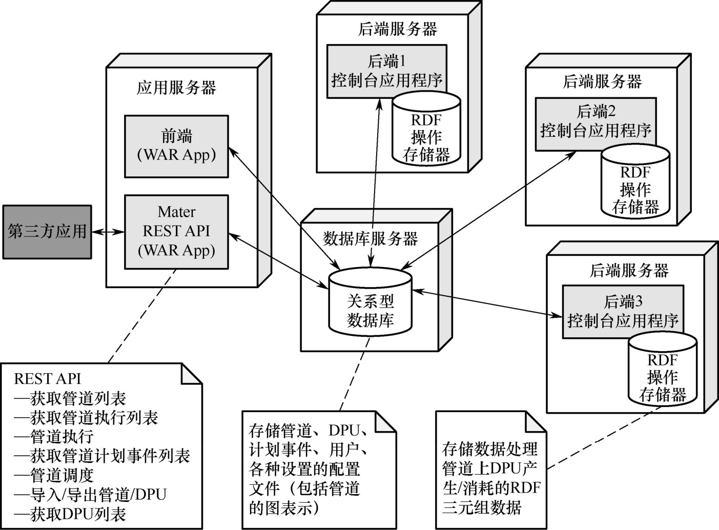 UnifiedViews [19] 是一个开源的抽取-转换-加载(Extraction-Transformation-Loading, ETL)框架,允许用户定义、执行、监控、调试、调度和共享RDF数据处理任务,简化了关联数据发布过程的创建和维护。图1-2展示了UnifiedViews总体架构,它提供了一个图形用户界面,数据处理任务在UnifiedViews中被表示为数据处理管道(Pipeline)。每个Pipeline都由一个或多个数据处理单元(Data Processing Unit, DPU)和这些单元之间的数据流组成,每个DPU都封装处理数据的特定业务逻辑,并且可以产生对应的输出。在不同的Pipeline中可以对DPU进行不同的配置。数据单元是DPU使用或生成数据的容器。UnifiedViews支持三种类型的数据单元:RDF数据单元,处理RDF图;文件数据单元,处理文件和文件夹;关系数据单元,处理关系数据库中的表。UnifiedViews有四种类型的DPU:Extractor是不定义任何输入数据单元的DPU,它的输入数据是依据DPU的业务逻辑从外部来源获取的,如Extractor可以从远程SPARQL端点查询数据,或从特定的URL集下载文件;Transformer是将输入转换为输出的DPU,它定义了输入和输出数据单元,如将表格数据转换为RDF数据或执行SPARQL查询;Loader是定义输入数据单元但不定义任何输出数据单元的DPU,其输出数据不由UnifiedViews维护,而由外部存储库进行存储;Quality Assessor是评估输入数据的质量并生成质量评估报告作为输出的DPU。此外,用户可以创建和部署自定义的DPU以满足所需功能要求。