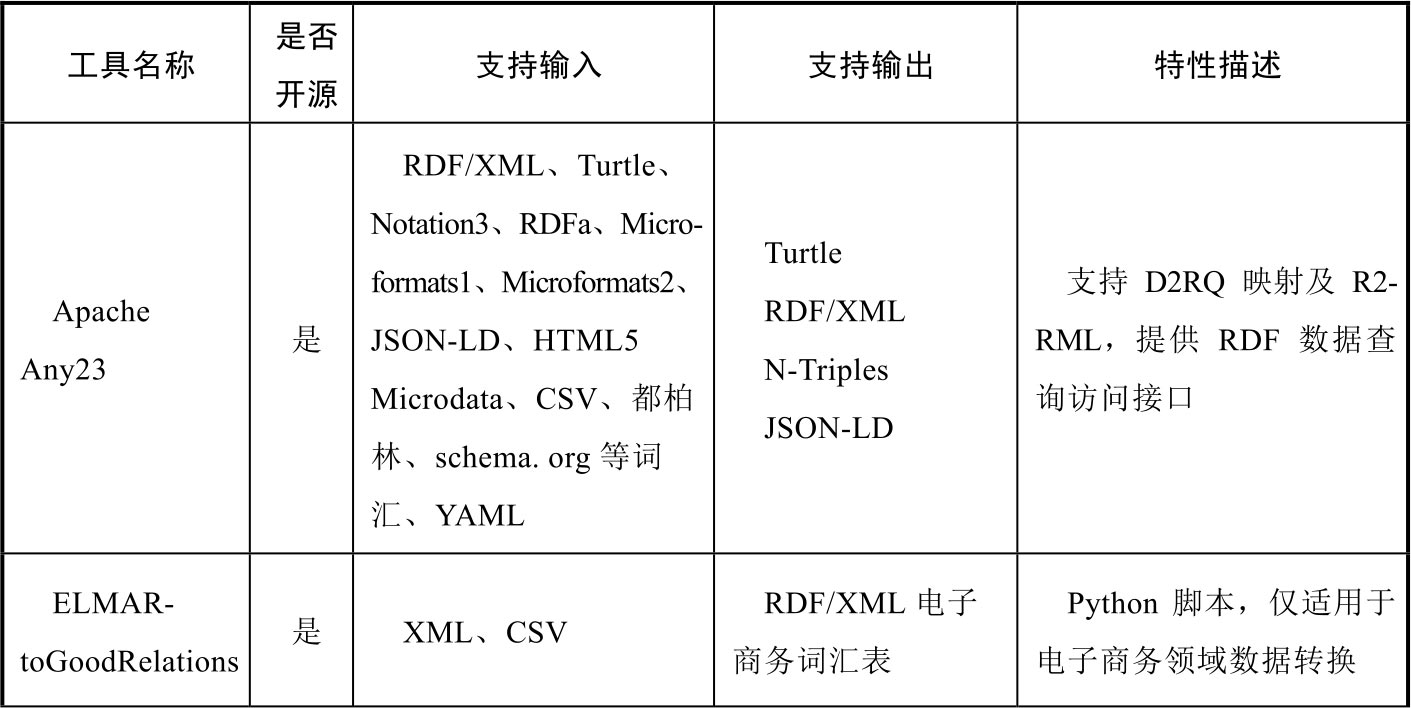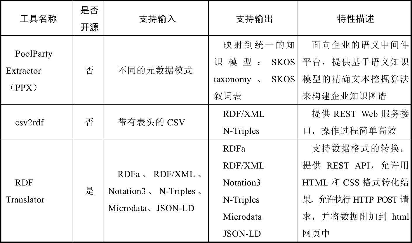 此外,除了关系型数据库,还有大量数据资源以结构化或半结构化文件格式存在,如CSV、Excel、XML、JSON等,基于此类数据的语义知识图谱构建也有一定的研究成果。本节针对部分重要且在领域广泛使用的工具或系统进行调研分析,其特性对比如表1-2所示。调查结果显示,针对不同的数据类型及应用场景,目前的语义知识图谱生成工具/系统提供在线编辑、单机版等若干服务形态。然而,大多需要编写自定义脚本或编程来执行数据转换,且支持的数据源和存储方式有所限制,随着数据规模的扩大和处理任务的复杂化,实践中将面临效率等各方面的挑战,如数据管理员定义了若干周期性的数据处理任务,使用时必须配置不同的调度脚本或者使用外部工具以确保任务执行,则工具配置和任务维护将消耗大量人力和时间。
