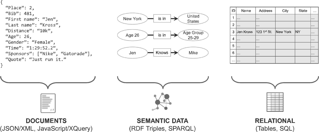MarkLogic是美国同名软件公司推出的多模型数据库,具备NoSQL和可信的企业数据管理功能,至今已有20年的发展历程,是集文档、语义图、地理空间和关系型模型优点于一体设计的可扩展、高性能数据库,内置的搜索引擎可为JSON、XML、文本、RDF三元组、地理空间和二进制文件(如PDF、图像、视频)提供统一的搜索和查询界面,减少标准查询构建、配置索引的时间。MarkLogic在文档、图形数据和关系型数据的存储和查询方面具备极高的灵活性且可以通过三元组在文档间建立关联。图1-8展示了MarkLogic多模型描述示例,包含三种有关Jen的事实和关系三元组的描述方式,用户可在保证数据一致性的前提下根据实际需求选择恰当的数据模型组合。