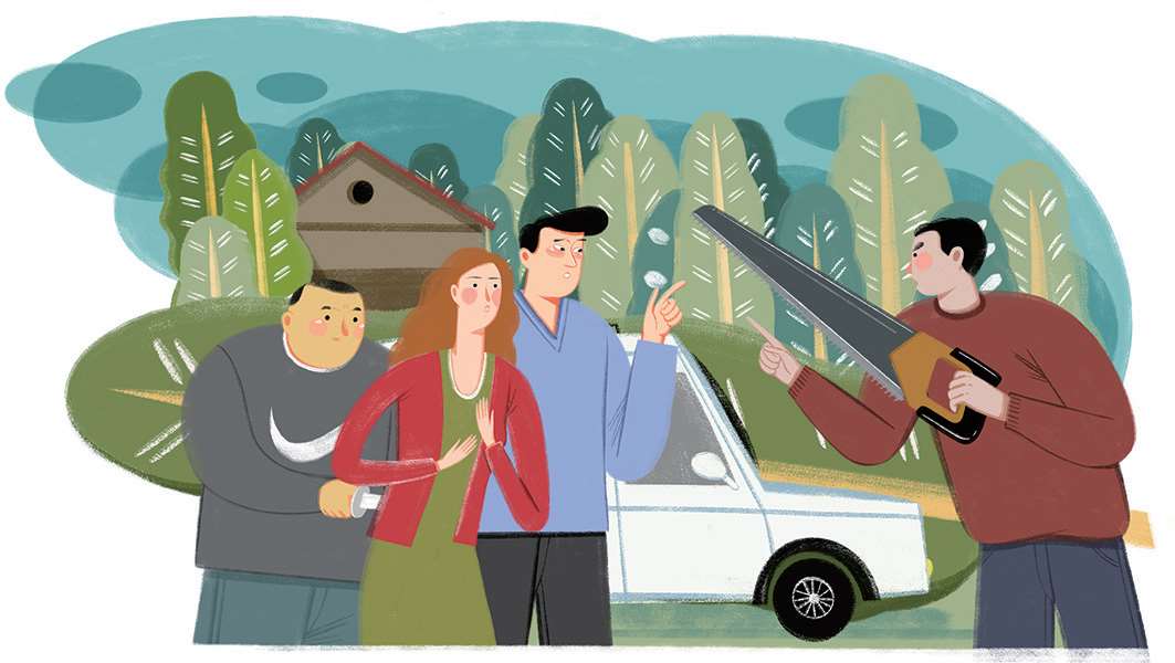 这时候,前方出现一座孤零零的房子,有个黑炭似的男人正在伐门前的杨树。好巧不巧,面包车刚要开过去,大树就轰然倒下,拦住了去路。