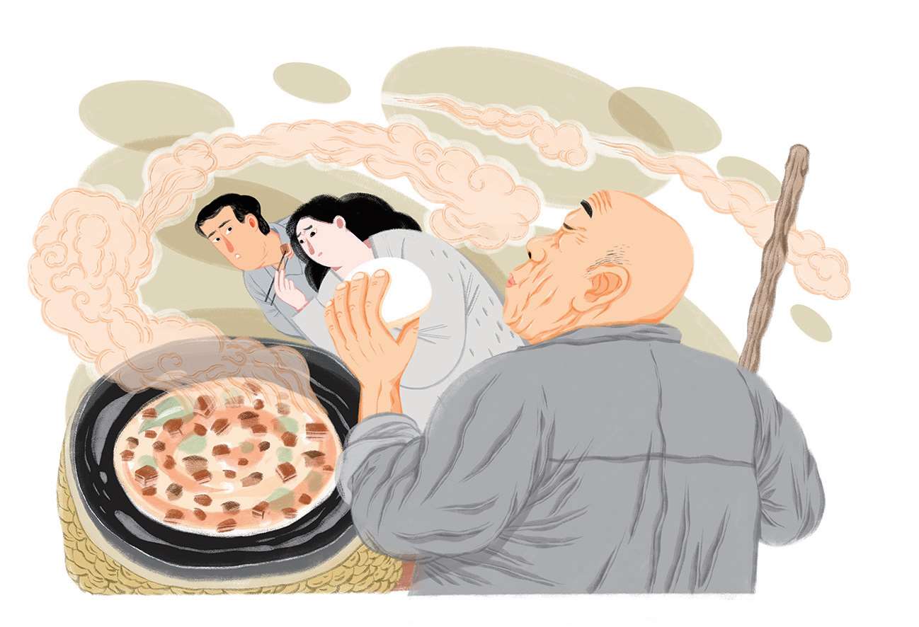 老头指了指正冒着热气的土灶,说:“这锅里炖着肉哩,咋会啥都没?”说着,他颤颤巍巍地从口袋里掏出大半个馒头来:“你们吃肉,借给我小半碗汤就行,牙口不好,我好把馒头泡软和了吃。”
