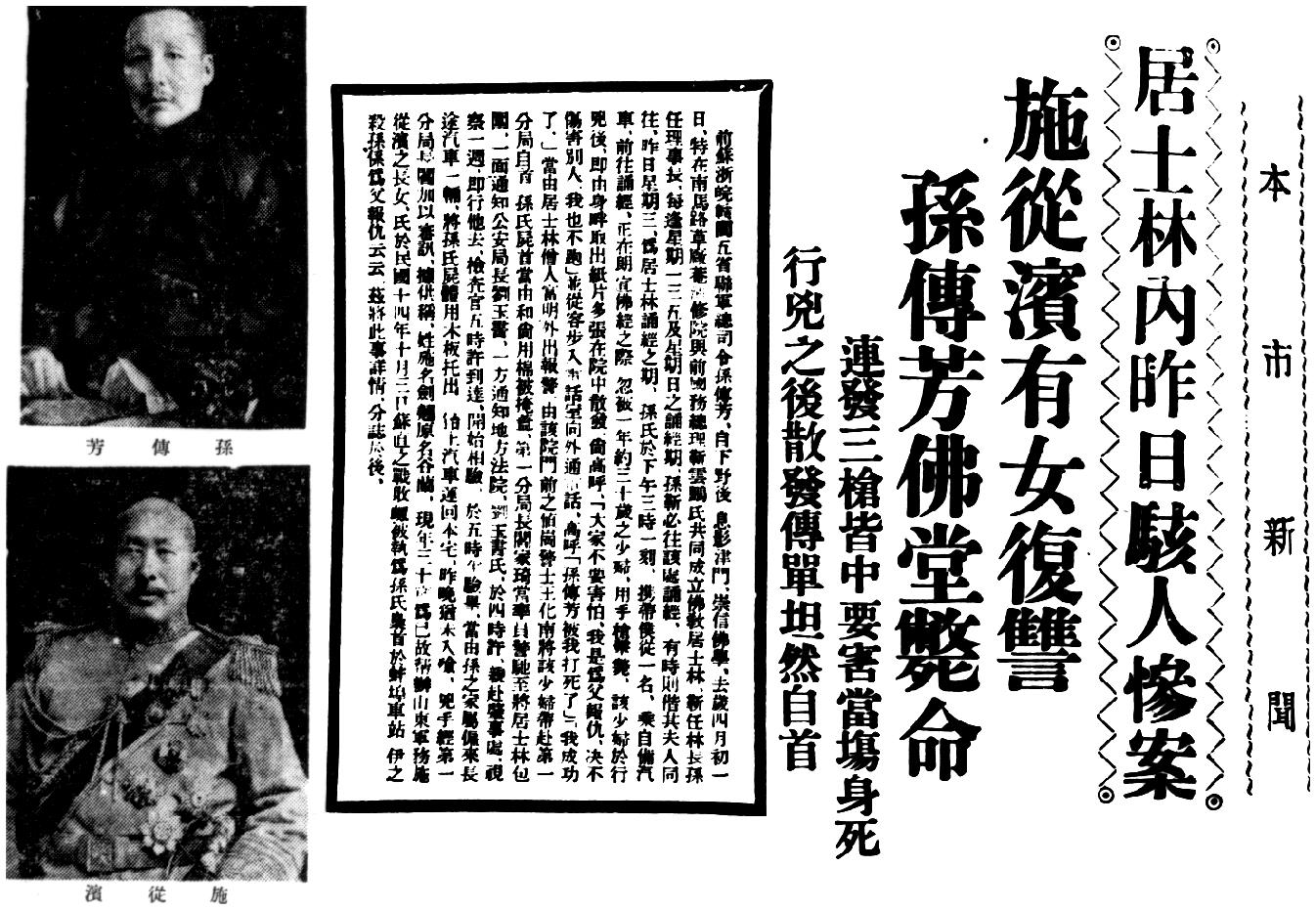 图二 报道刺杀案的新闻中孙传芳(上)和施从滨(下)的照片,摘自天津《大公报》,1935年11月14日。
