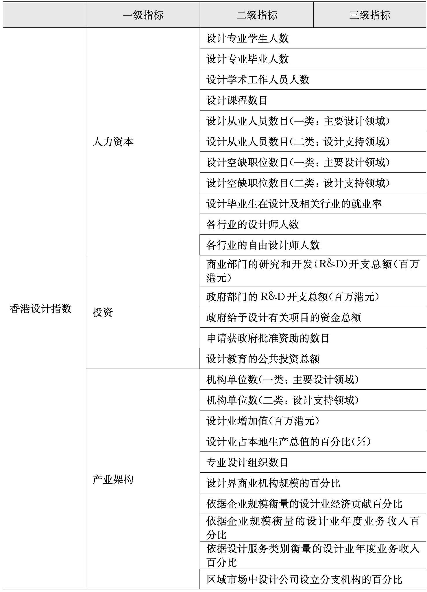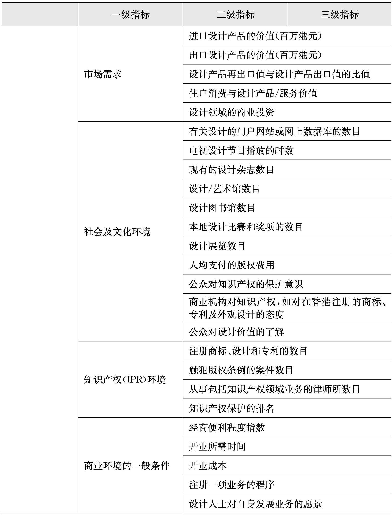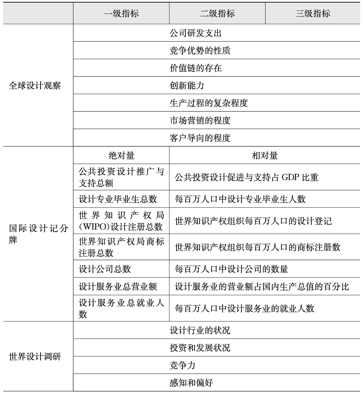 除此之外,设计指数研究成为宏观设计管理研究参考的重要文献资料。如新西兰经济研究所在2002年根据全球竞争力报告提取了设计相关的产品独创性、品牌价值链进行对比,发布了首个从竞争力角度阐述设计价值的研究报告《通过设计提升价值的可行性分析》;阿尔托大学DesignUM设计创意中心于2012年发布的《全球设计观察》( Global Design Watch )对全球十多个国家进行优势排名;韩国设计振兴院分别于2010年、2012年、2014年向多个国家发布《世界设计调研》( World Design Survey ),侧重于分析政策对设计产业造成的影响;剑桥大学设计工程研究所在2010年发布《国际设计记分牌》( International Design Scoreboard ),将设计作为由有利条件、投入、产出和成果组成的系统,这为衡量国家设计能力提供了框架;英国Design Council自2010年开始每年都发布《设计经济》( The Design Economy ),主要统计本国设计产业发展状况;中国香港于2010年发布《香港设计指数:初阶发展报告》,亦是从城市区域角度出发,研究城市设计环境指数。中科院创新设计课题组近几年也做了很多工作,如同济大学创新设计研究中心发布《全球创新设计竞争力报告2019》,参考钻石模型进行了数十个国家的设计竞争力排名。本研究整理了这些设计指数,如表2-2所示。