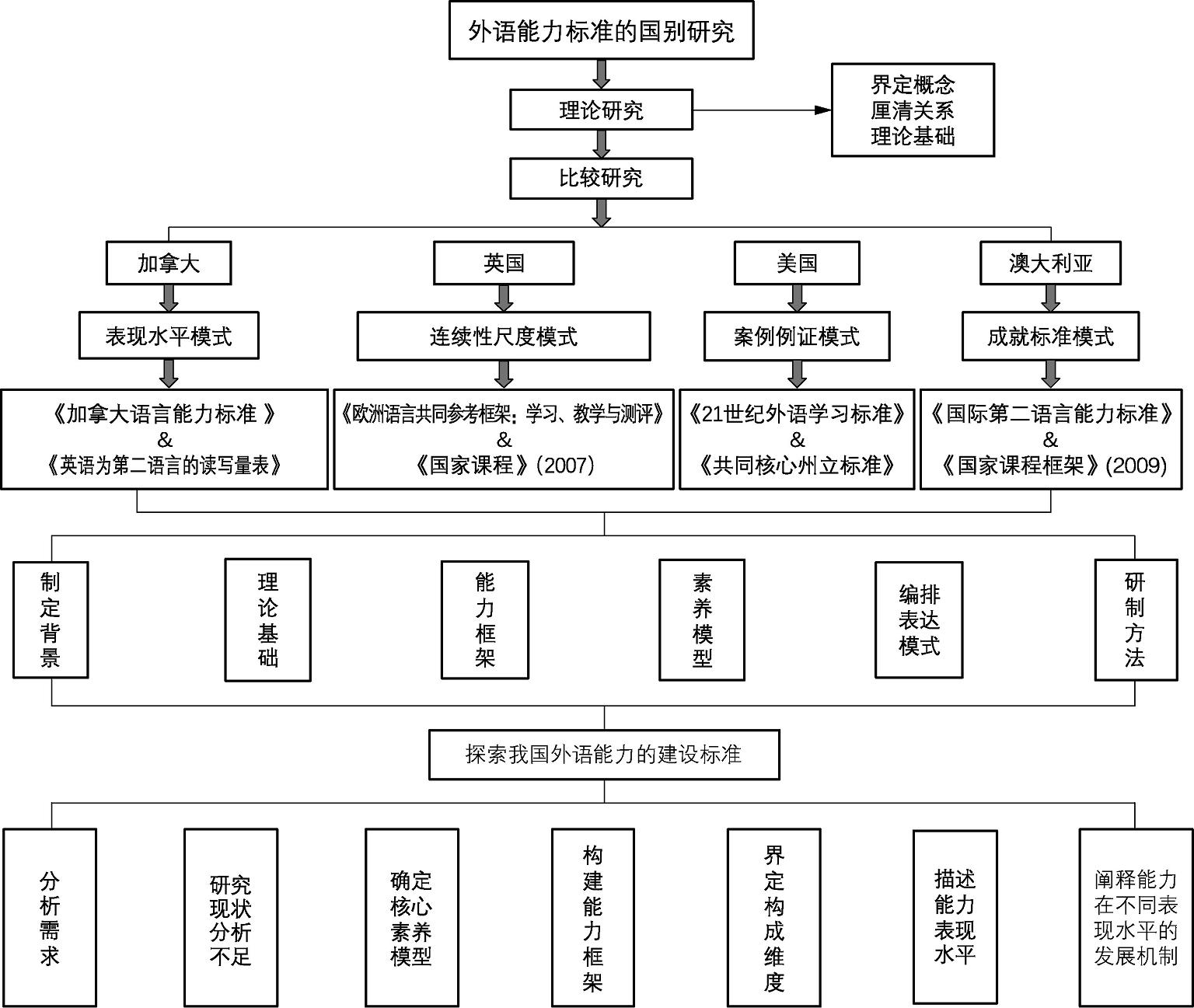 (2)选择国际上的成功典范(加拿大、英国、美国和澳大利亚等国家),即有代表性的语言能力标准进行专项研究和国际比较研究。从制定背景(需求分析)、理论基础、能力框架、素养模型、编排表述模式、研制和完善方法六大维度仔细研究加拿大的《加拿大语言能力标准》,英国的《国家课程》(2007)和欧洲的《欧框》,美国的《21世纪外语学习标准》和《共同核心州立标准》;澳大利亚的《国际第二语言能力标准》和《国家课程框架》(2009)。通过能力标准基本框架的比较研究,表述模式的比较研究,评估工具的比较研究等,尝试建立外语能力标准研究的模型,实现本研究领域的知识创新。