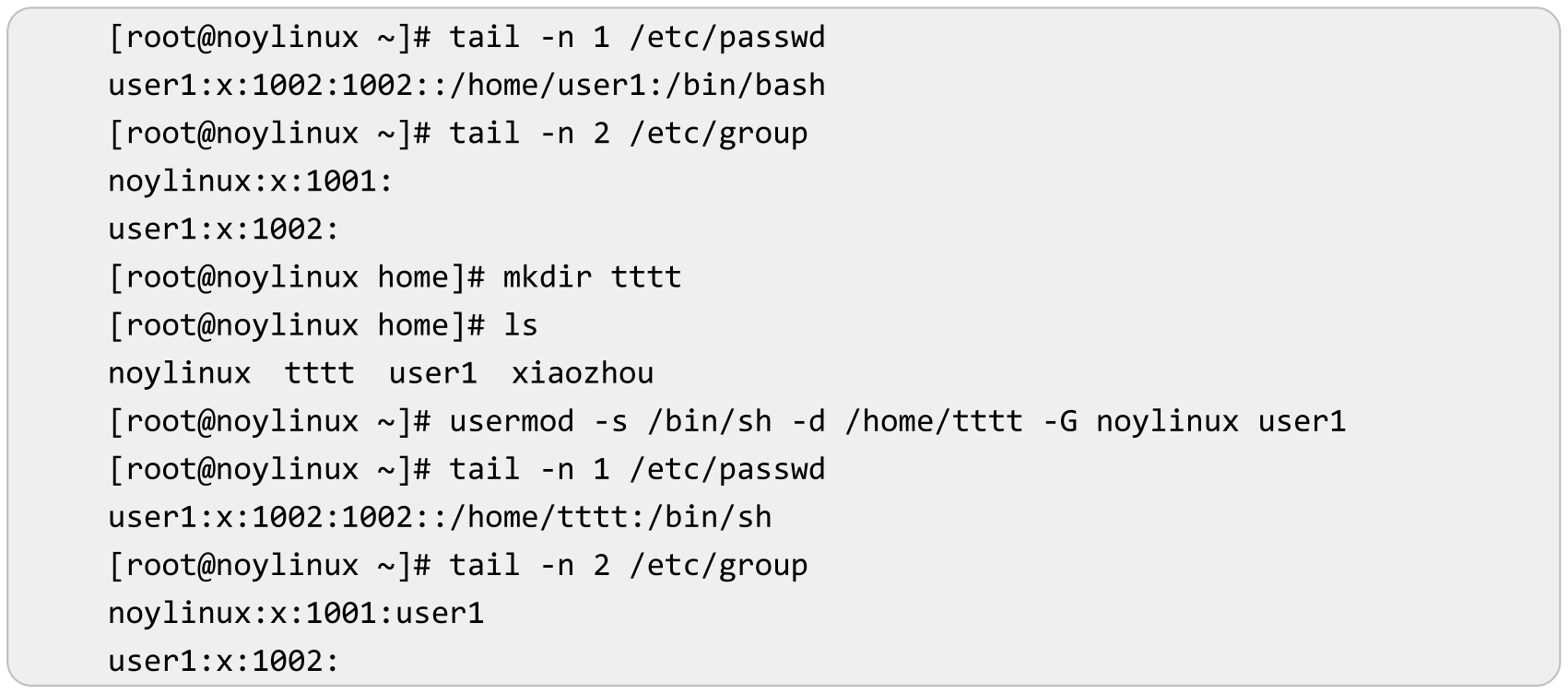 将用户user1的登录Shell修改为sh,主目录改为“/home/tttt”,并将此用户附加到noylinux用户组中。