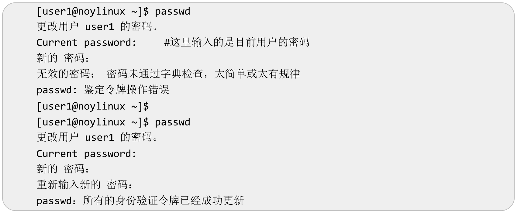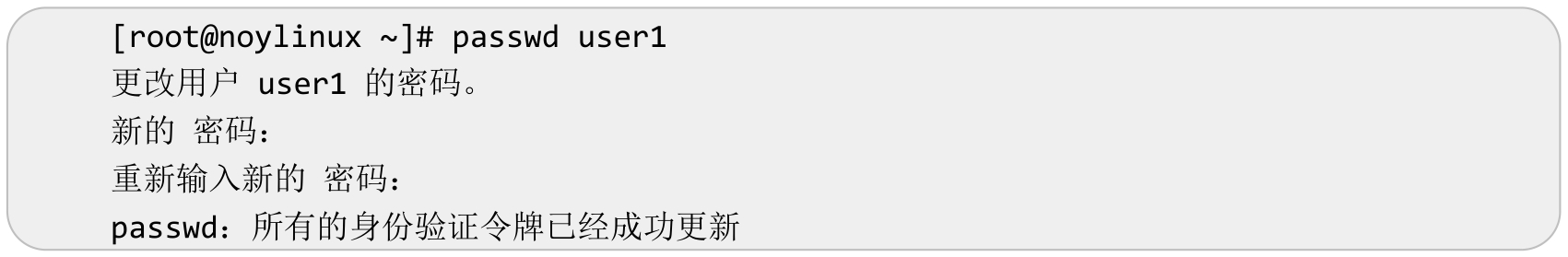 描述:用useradd命令创建完用户后还无法登录,因为没有设置密码,passwd命令就是用来设置用户的认证信息的,包括用户密码、密码过期时间等,除此之外还可以用此命令重置用户密码。