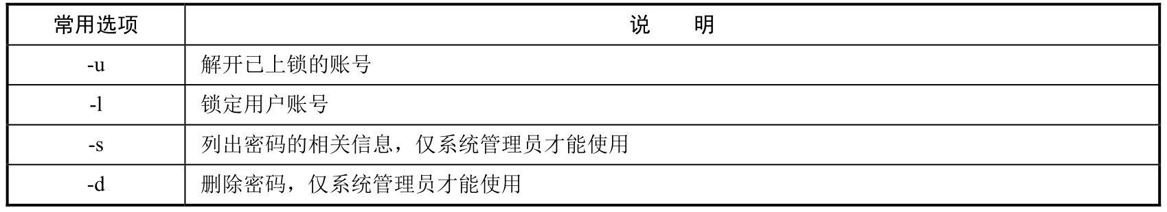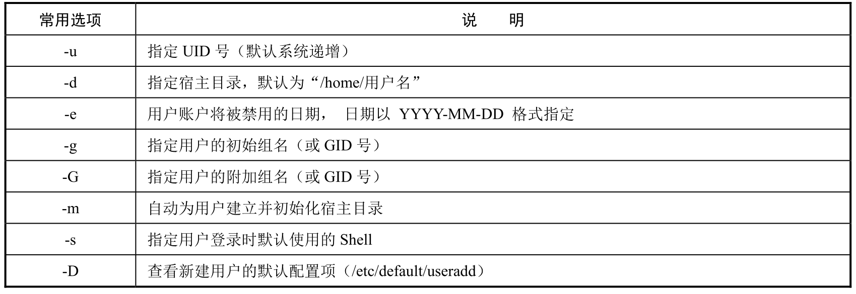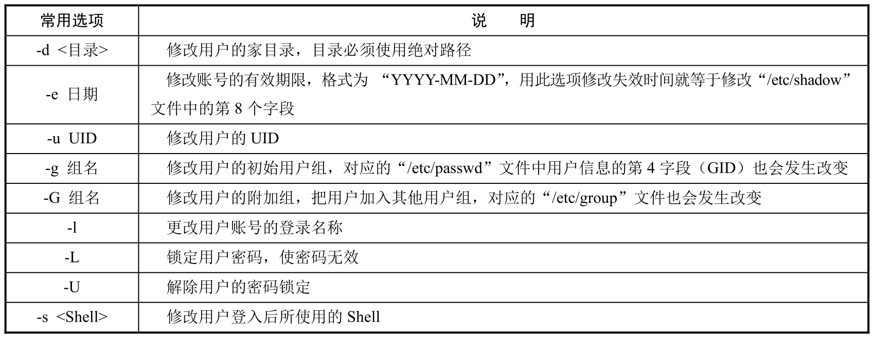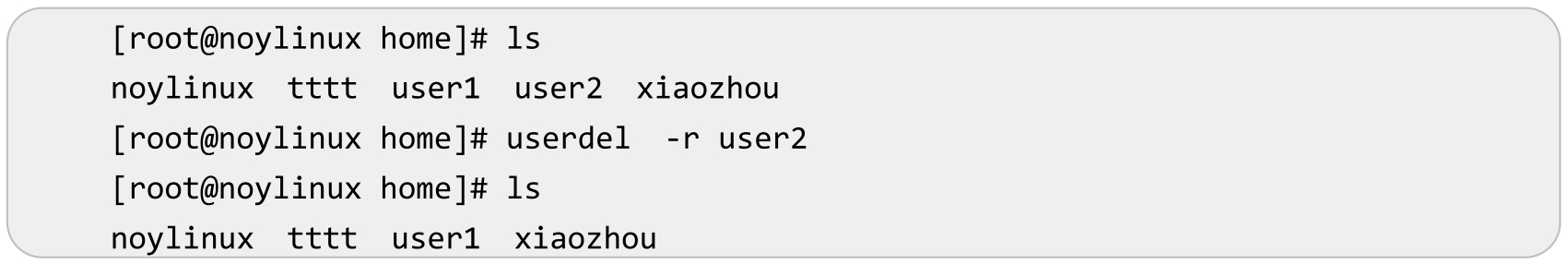 描述:用于删除给定的用户以及与用户相关的文件。若不加选项,则仅删除用户账号,而不删除相关文件。-r选项表示删除用户的同时,删除与用户相关的所有文件。