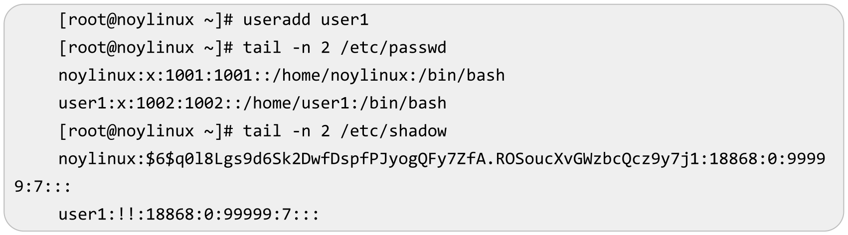 (2)根据这两个配置文件中定义的默认配置参数去添加用户,添加用户的过程中会自动创建对应的初始用户组,同时还会在“/etc/passwd”“/etc/group”“/etc/shadow”“/etc/gshadow”这4个文件中添加一行关于这个用户和组的相关信息。
