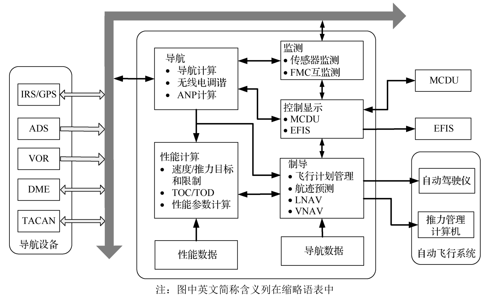 飞行管理系统(Flight Management System,FMS)是大型客机数字化电子系统的核心,是集航迹预测、性能优化、综合导航、飞行引导、信息显示、飞行控制等功能为一体的综合系统。飞行管理系统通过组织、协调和综合飞机上多个航空电子系统的功能,在飞行过程中管理飞行计划、提供参考航迹、计算最优性能参数、按照参考轨迹与导航数据引导飞机飞行,保证飞行计划的实施,协助飞行员完成从起飞到着陆的各项任务,管理、监视和操纵飞机以实现全航程自动飞行。