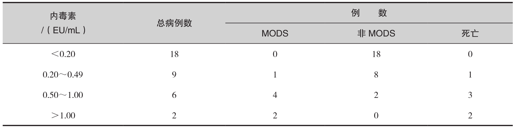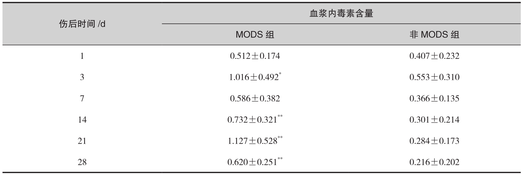 表6-6 严重烧伤后MODS、非MODS患者血浆内毒素含量比较