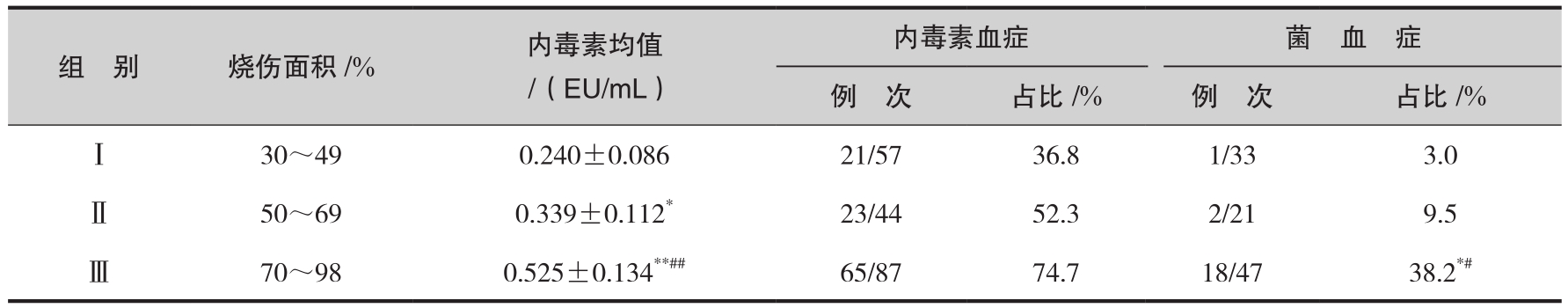 表6-1 不同烧伤面积内毒素血症、菌血症阳性率的比较