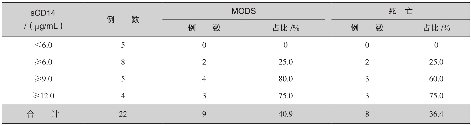 另一组资料观察到,生理及病理情况下血清中均存在一定水平的sCD14。大面积烧伤早期sCD14含量改变不明显,伤后第7天则明显升高,且一直持续至伤后第3周。进一步分析可见,烧伤后第7天、14天和21天MODS组sCD14水平显著高于非MODS组(表6-4),且sCD14升高程度与MODS发生呈平行关系,当其均值超过9.00µg/mL时,9例患者中有7例发生了MODS。这一观察结果提示,sCD14水平与严重烧伤后MODS的发生、发展密切相关,动态监测其改变对MODS的发病过程具有一定的预警意义。值得注意的是,sCD14含量不仅与MODS的发生有关,而且与患者的预后密切相关。该组资料中,随着sCD14均值的不断上升,患者病死率亦逐渐增高。sCD14含量持续于较高水平(≥9.0µg/mL)常为预后不良之兆(表6-5)。由此可见,动态检测sCD14的变化是判断严重烧伤后病情转归较为客观的指标。