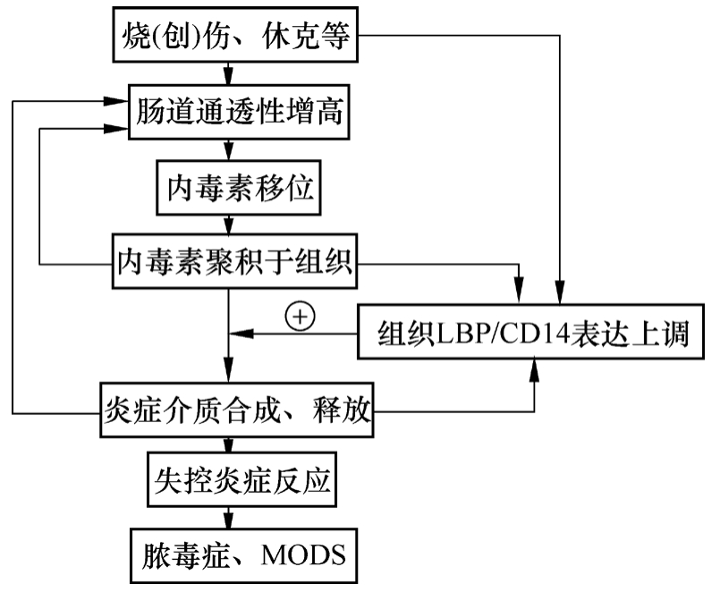 基于上述分析可知,LBP/CD14系统通过介导内毒素刺激组织合成、释放TNF-α等炎症介质,在烧(创)伤后脓毒症、MODS的发病机制中发挥重要作用。而组织LBP/CD14 mRNA表达增加可能是严重创伤增敏内源性内毒素作用,从而发挥其生物学效应的主要分子基础。由此,我们设想烧(创)伤、休克后脓毒症、MODS可能是循以下途径发生、发展的(图6-1):创伤、烧伤、休克等应激状态(首次打击)一方面引起机体LBP/CD14系统表达上调,使机体对内毒素的敏感性增高(致敏阶段);另一方面,由于免疫抑制、肠道通透性增高以及菌群紊乱等因素,促进肠源性内毒素移位,并聚积于局部组织(二次打击)。组织内毒素通过表达上调的LBP/CD14系统激活多种炎症细胞,释放炎症细胞因子(TNF-α等)。同时,内毒素及炎症介质一方面持续上调组织LBP/CD14表达,另一方面则进一步加重肠黏膜损伤,促进内毒素移位。从而在内毒素- LBP/CD14 -炎症介质之间形成一正反馈环,致使炎症反应不断放大、加重,最终导致全身失控性炎症反应和MODS。