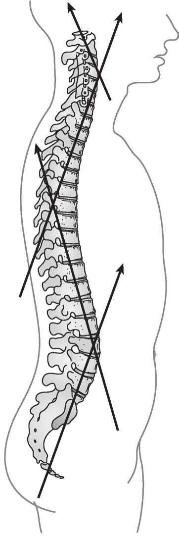 这也解释了脊柱前凸的重要性,当身体往前弯曲时,脊柱前凸可以增加椎间盘后侧承受压力的门槛(图3.10)。平背失去了这个重要的安全机制(图3.11),许多有平背问题的人常常受到背痛之苦。因此,我们可将平背定义为一种复杂的异常症状,其包含骨骼肌系统与神经系统均出现功能的障碍。