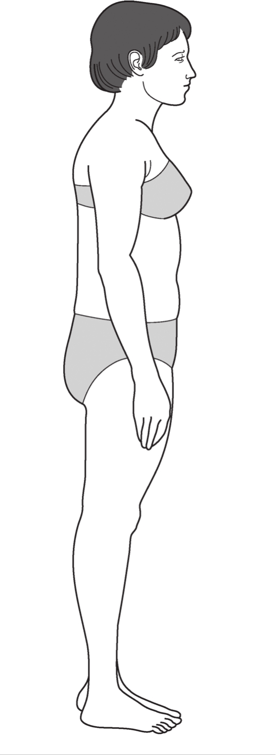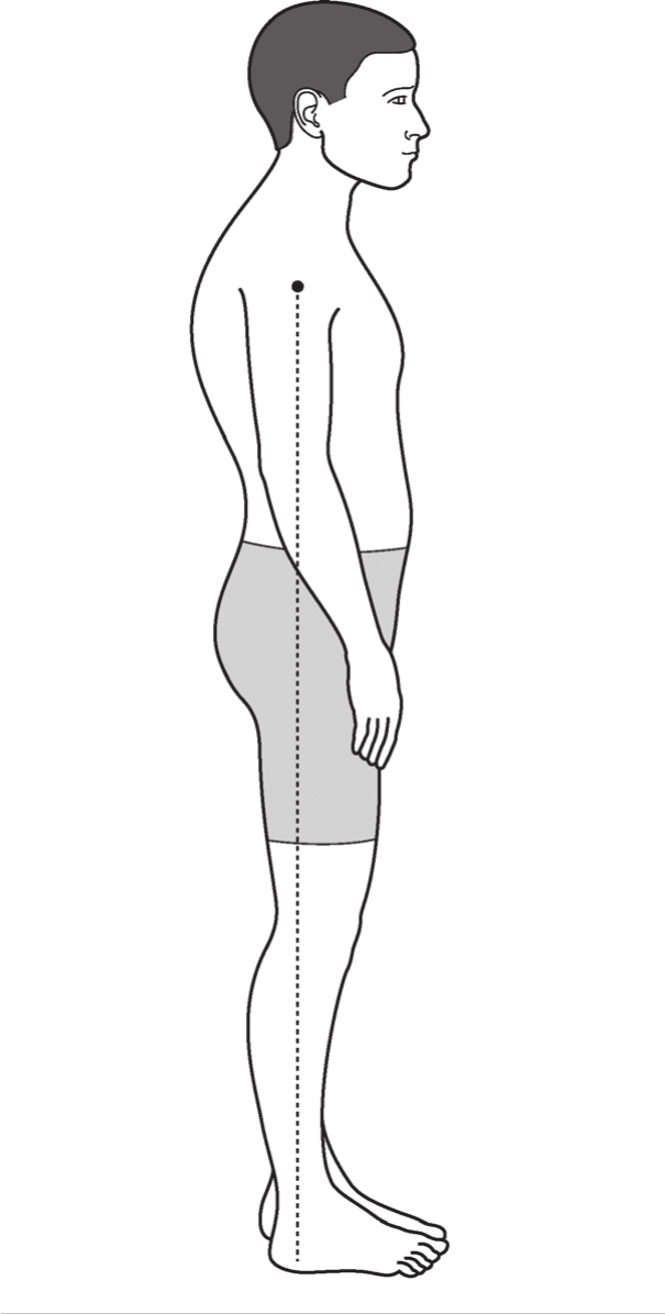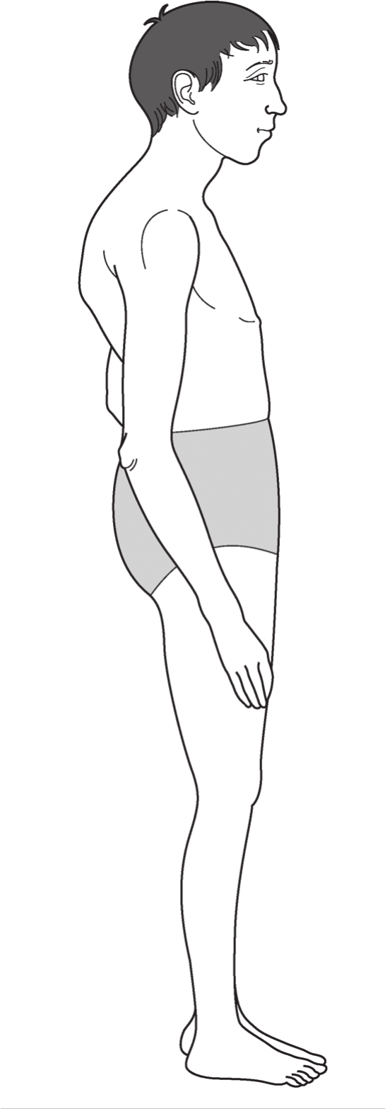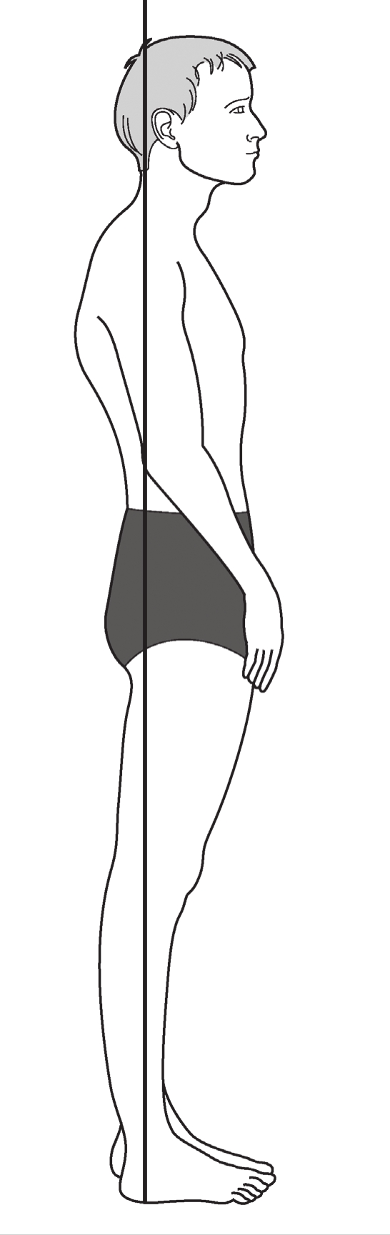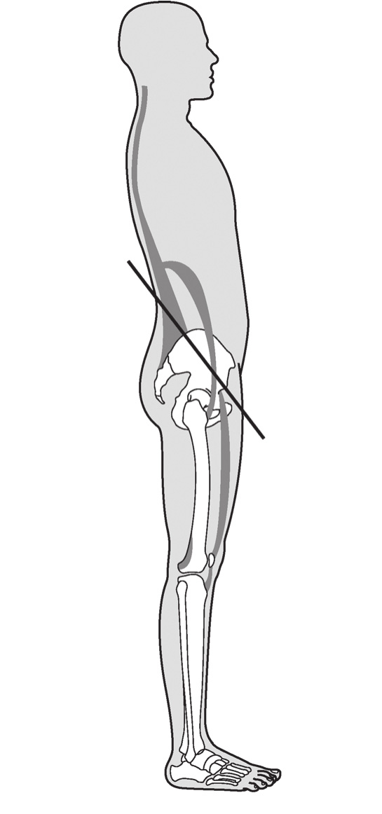 相对于正常情况,平背的特征是脊柱前凸的角度变小(图3.9)。除了遗传因素之外,其他导致平背的原因还包括髋屈肌无力与大腿后群肌过短。这两者均会影响骨盆的位置,使骨盆往后倾斜。