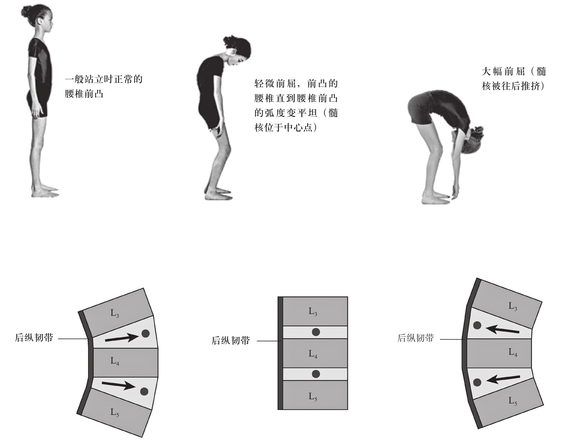 脊柱的解剖学结构特点为有脊柱弯曲的弧度。弧度维持在正常运动范围内,颈椎与腰椎前凸会使椎骨前侧的间隔变宽,而椎骨后侧的间隔变窄(图3.10)。因此,当椎间盘承受重量时,会固定保持轻微向前的压力。脊柱弯曲时,椎间盘压力会转移至后方,后纵韧带对椎管的硬膜施加压力,在某些情况下此压力会带来疼痛。