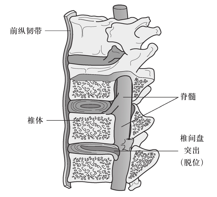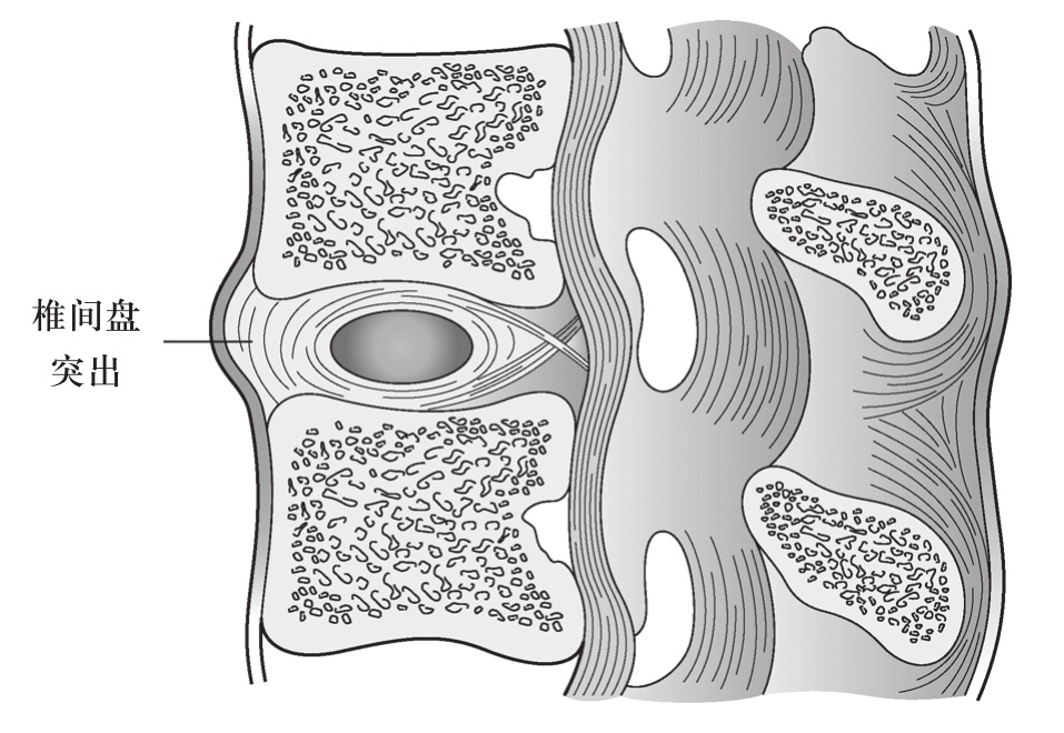 2. 椎间盘突出(脱位):椎间盘严重受损的情况,部分髓核渗出椎间盘外,并带给神经结构压力(图3.15)。